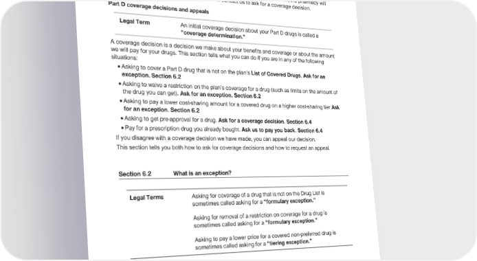 2024 Evidence of Coverage for UnitedHealthcare® Group Medicare Advantage PEBB Balance (PPO) Chapter 9: What to do if you have a problem or complaint (coverage decisions, appeals, complaints) 208 · If your pharmacy tells you that your prescription cannot be filled as written, the pharmacy will give you a written notice explaining how to contact us to ask for a coverage decision. Part D coverage decisions and appeals Legal Term An initial coverage decision about your Part D drugs is called a “coverage determination.” A coverage decision is a decision we make about your benefits and coverage or about the amount we will pay for your drugs. This section tells what you can do if you are in any of the following situations: · Asking to cover a Part D drug that is not on the plan’s List of Covered Drugs. Ask for an exception. Section 6.2 · Asking to waive a restriction on the plan’s coverage for a drug (such as limits on the amount of the drug you can get). Ask for an exception. Section 6.2 · Asking to pay a lower cost-sharing amount for a covered drug on a higher cost-sharing tier Ask for an exception. Section 6.2 · Asking to get pre-approval for a drug. Ask for a coverage decision. Section 6.4 · Pay for a prescription drug you already bought. Ask us to pay you back. Section 6.4 If you disagree with a coverage decision we have made, you can appeal our decision. This section tells you both how to ask for coverage decisions and how to request an appeal. Section 6.2 What is an exception? Legal Terms Asking for coverage of a drug that is not on the Drug List is sometimes called asking for a “formulary exception.” Asking for removal of a restriction on coverage for a drug is sometimes called asking for a “formulary exception.” Asking to pay a lower price for a covered non-preferred drug is sometimes called asking for a “tiering exception.” If a drug is not covered in the way you would like it to be covered, you can ask us to make an “exception.” An exception is a type of coverage decision. For us to consider your exception request, your doctor or other prescriber will need to explain the medical reasons why you need the exception approved. Here are three examples of exceptions that you or your doctor or other prescriber can ask us to make: