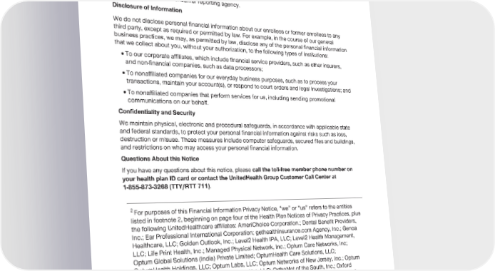2024 Evidence of Coverage for UnitedHealthcare® Group Medicare Advantage PEBB Balance (PPO) Chapter 8: Your rights and responsibilities 189 · Information about your transactions with us, our affiliates or others, such as premium payment and claims history; and · Information from a consumer reporting agency. Disclosure of Information We do not disclose personal financial information about our enrollees or former enrollees to any third party, except as required or permitted by law. For example, in the course of our general business practices, we may, as permitted by law, disclose any of the personal financial information that we collect about you, without your authorization, to the following types of institutions: · To our corporate affiliates, which include financial service providers, such as other insurers, and non-financial companies, such as data processors; · To nonaffiliated companies for our everyday business purposes, such as to process your transactions, maintain your account(s), or respond to court orders and legal investigations; and · To nonaffiliated companies that perform services for us, including sending promotional communications on our behalf. Confidentiality and Security We maintain physical, electronic and procedural safeguards, in accordance with applicable state and federal standards, to protect your personal financial information against risks such as loss, destruction or misuse. These measures include computer safeguards, secured files and buildings, and restrictions on who may access your personal financial information. Questions About this Notice If you have any questions about this notice, please call the toll-free member phone number on your health plan ID card or contact the UnitedHealth Group Customer Call Center at 1-855-873-3268 (TTY/RTT 711). 2 For purposes of this Financial Information Privacy Notice, “we” or “us” refers to the entities listed in footnote 2, beginning on page four of the Health Plan Notices of Privacy Practices, plus the following UnitedHealthcare affiliates: AmeriChoice Corporation.; Dental Benefit Providers, Inc.; Ear Professional International Corporation; gethealthinsurance.com Agency, Inc.; Genoa Healthcare, LLC; Golden Outlook, Inc.; Level2 Health IPA, LLC; Level2 Health Management, LLC; Life Print Health, Inc.; Managed Physical Network, Inc.; Optum Care Networks, Inc; Optum Global Solutions (India) Private Limited; OptumHealth Care Solutions, LLC; OptumHealth Holdings, LLC; Optum Labs, LLC; Optum Networks of New Jersey, Inc.; Optum Women’s and Children’s Health, LLC; OrthoNet, LLC; OrthoNet of the South, Inc.; Oxford Benefit Management, Inc.; Oxford Health Plans LLC; Physician Alliance of the Rockies, LLC; POMCO Network, Inc.; POMCO, Inc.; Real Appeal, Inc.; Sanvello Health, Inc.; Spectera, Inc.; Three Rivers Holdings, Inc.; UHIC Holdings, Inc.; UMR, Inc.; ;United Behavioral Health; United Behavioral Health of New York I.P.A., Inc.; UnitedHealthcare, Inc.; United HealthCare Services, Inc.; UnitedHealth Advisors, LLC; UnitedHealthcare Service LLC; Urgent Care MSO, LLC;