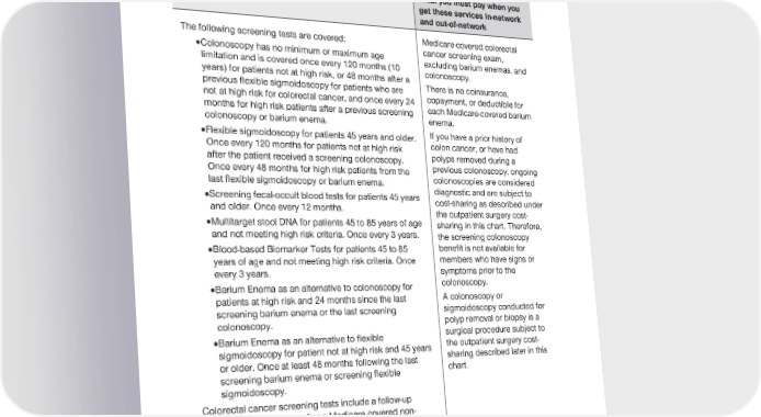 2024 Evidence of Coverage for UnitedHealthcare® Group Medicare Advantage PEBB Balance (PPO) Chapter 4: Medical Benefits Chart (what is covered and what you pay) 83 Services that are covered for you What you must pay when you get these services in-network and out-of-network The following screening tests are covered: Medicare-covered colorectal · Colonoscopy has no minimum or maximum age cancer screening exam, limitation and is covered once every 120 months (10 excluding barium enemas, and years) for patients not at high risk, or 48 months after a colonoscopy. previous flexible sigmoidoscopy for patients who are There is no coinsurance, not at high risk for colorectal cancer, and once every 24 copayment, or deductible for months for high risk patients after a previous screening each Medicare-covered barium colonoscopy or barium enema. enema. · Flexible sigmoidoscopy for patients 45 years and older. If you have a prior history of Once every 120 months for patients not at high risk colon cancer, or have had after the patient received a screening colonoscopy. polyps removed during a Once every 48 months for high risk patients from the previous colonoscopy, ongoing last flexible sigmoidoscopy or barium enema. colonoscopies are considered · Screening fecal-occult blood tests for patients 45 years diagnostic and are subject to and older. Once every 12 months. cost-sharing as described under the outpatient surgery cost- · Multitarget stool DNA for patients 45 to 85 years of age sharing in this chart. Therefore, and not meeting high risk criteria. Once every 3 years. the screening colonoscopy · Blood-based Biomarker Tests for patients 45 to 85 benefit is not available for years of age and not meeting high risk criteria. Once members who have signs or every 3 years. symptoms prior to the · Barium Enema as an alternative to colonoscopy for colonoscopy. patients at high risk and 24 months since the last A colonoscopy or screening barium enema or the last screening sigmoidoscopy conducted for colonoscopy. polyp removal or biopsy is a · Barium Enema as an alternative to flexible surgical procedure subject to sigmoidoscopy for patient not at high risk and 45 years the outpatient surgery cost- or older. Once at least 48 months following the last sharing described later in this screening barium enema or screening flexible chart. sigmoidoscopy. Colorectal cancer screening tests include a follow-up screening colonoscopy after a Medicare covered non- invasive stool-based colorectal cancer screening test returns a positive result.