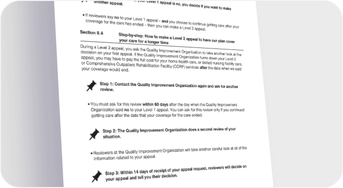 2024 Evidence of Coverage for UnitedHealthcare® Group Medicare Advantage PEBB Complete (PPO) Chapter 9: What to do if you have a problem or complaint (coverage decisions, appeals, complaints) 224 Step 4: If the answer to your Level 1 appeal is no, you decide if you want to make another appeal. · If reviewers say no to your Level 1 appeal – and you choose to continue getting care after your coverage for the care has ended – then you can make a Level 2 appeal. Section 8.4 Step-by-step: How to make a Level 2 appeal to have our plan cover your care for a longer time During a Level 2 appeal, you ask the Quality Improvement Organization to take another look at the decision on your first appeal. If the Quality Improvement Organization turns down your Level 2 appeal, you may have to pay the full cost for your home health care, or skilled nursing facility care, or Comprehensive Outpatient Rehabilitation Facility (CORF) services after the date when we said your coverage would end. Step 1: Contact the Quality Improvement Organization again and ask for another review. · You must ask for this review within 60 days after the day when the Quality Improvement Organization said no to your Level 1 appeal. You can ask for this review only if you continued getting care after the date that your coverage for the care ended. Step 2: The Quality Improvement Organization does a second review of your situation. · Reviewers at the Quality Improvement Organization will take another careful look at all of the information related to your appeal. Step 3: Within 14 days of receipt of your appeal request, reviewers will decide on your appeal and tell you their decision. What happens if the review organization says yes? · We must reimburse you for our share of the costs of care you have received since the date when we said your coverage would end. We must continue providing coverage for the care for as long as it is medically necessary. · You must continue to pay your share of the costs and there may be coverage limitations that apply.