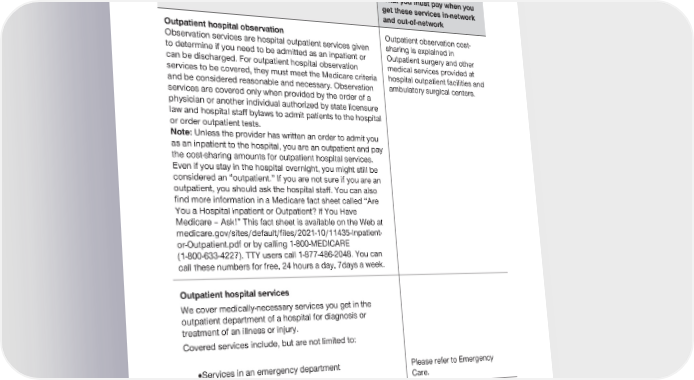 2024 Evidence of Coverage for UnitedHealthcare® Group Medicare Advantage PEBB Complete (PPO) Chapter 4: Medical Benefits Chart (what is covered and what you pay) 107 Services that are covered for you What you must pay when you get these services in-network and out-of-network Outpatient hospital observation Outpatient observation cost- Observation services are hospital outpatient services given sharing is explained in to determine if you need to be admitted as an inpatient or Outpatient surgery and other can be discharged. For outpatient hospital observation medical services provided at services to be covered, they must meet the Medicare criteria hospital outpatient facilities and and be considered reasonable and necessary. Observation ambulatory surgical centers. services are covered only when provided by the order of a physician or another individual authorized by state licensure law and hospital staff bylaws to admit patients to the hospital or order outpatient tests. Note: Unless the provider has written an order to admit you as an inpatient to the hospital, you are an outpatient and pay the cost-sharing amounts for outpatient hospital services. Even if you stay in the hospital overnight, you might still be considered an “outpatient.” If you are not sure if you are an outpatient, you should ask the hospital staff. You can also find more information in a Medicare fact sheet called “Are You a Hospital Inpatient or Outpatient? If You Have Medicare – Ask!” This fact sheet is available on the Web at medicare.gov/sites/default/files/2021-10/11435-Inpatient- or-Outpatient.pdf or by calling 1-800-MEDICARE (1-800-633-4227). TTY users call 1-877-486-2048. You can call these numbers for free, 24 hours a day, 7days a week. Outpatient hospital services We cover medically-necessary services you get in the outpatient department of a hospital for diagnosis or treatment of an illness or injury. Covered services include, but are not limited to: · Services in an emergency department Please refer to Emergency Care.
