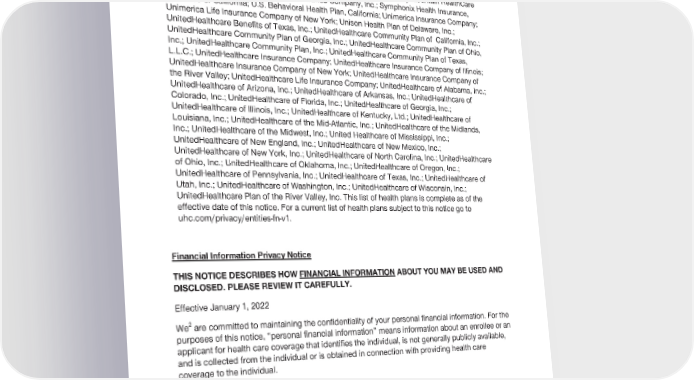 2024 Evidence of Coverage for UnitedHealthcare® Group Medicare Advantage PEBB Complete (PPO) Chapter 8: Your rights and responsibilities 186 Peoples Health, Inc.; Physicians Health Choice of Texas, LLC; Preferred Care Partners, Inc.; Rocky Mountain Health Maintenance Organization, Incorporated; Rocky Mountain HealthCare Options, Inc.; Sierra Health and Life Insurance Company, Inc.; Symphonix Health Insurance, Inc.; UHC of California; U.S. Behavioral Health Plan, California; Unimerica Insurance Company; Unimerica Life Insurance Company of New York; Unison Health Plan of Delaware, Inc.; UnitedHealthcare Benefits of Texas, Inc.; UnitedHealthcare Community Plan of California, Inc.; UnitedHealthcare Community Plan of Georgia, Inc.; UnitedHealthcare Community Plan of Ohio, Inc.; UnitedHealthcare Community Plan, Inc.; UnitedHealthcare Community Plan of Texas, L.L.C.; UnitedHealthcare Insurance Company; UnitedHealthcare Insurance Company of Illinois; UnitedHealthcare Insurance Company of New York; UnitedHealthcare Insurance Company of the River Valley; UnitedHealthcare Life Insurance Company; UnitedHealthcare of Alabama, Inc.; UnitedHealthcare of Arizona, Inc.; UnitedHealthcare of Arkansas, Inc.; UnitedHealthcare of Colorado, Inc.; UnitedHealthcare of Florida, Inc.; UnitedHealthcare of Georgia, Inc.; UnitedHealthcare of Illinois, Inc.; UnitedHealthcare of Kentucky, Ltd.; UnitedHealthcare of Louisiana, Inc.; UnitedHealthcare of the Mid-Atlantic, Inc.; UnitedHealthcare of the Midlands, Inc.; UnitedHealthcare of the Midwest, Inc.; United Healthcare of Mississippi, Inc.; UnitedHealthcare of New England, Inc.; UnitedHealthcare of New Mexico, Inc.; UnitedHealthcare of New York, Inc.; UnitedHealthcare of North Carolina, Inc.; UnitedHealthcare of Ohio, Inc.; UnitedHealthcare of Oklahoma, Inc.; UnitedHealthcare of Oregon, Inc.; UnitedHealthcare of Pennsylvania, Inc.; UnitedHealthcare of Texas, Inc.; UnitedHealthcare of Utah, Inc.; UnitedHealthcare of Washington, Inc.; UnitedHealthcare of Wisconsin, Inc.; UnitedHealthcare Plan of the River Valley, Inc. This list of health plans is complete as of the effective date of this notice. For a current list of health plans subject to this notice go to uhc.com/privacy/entities-fn-v1. Financial Information Privacy Notice THIS NOTICE DESCRIBES HOW FINANCIAL INFORMATION ABOUT YOU MAY BE USED AND DISCLOSED. PLEASE REVIEW IT CAREFULLY. Effective January 1, 2022 2 We are committed to maintaining the confidentiality of your personal financial information. For the purposes of this notice, “personal financial information” means information about an enrollee or an applicant for health care coverage that identifies the individual, is not generally publicly available, and is collected from the individual or is obtained in connection with providing health care coverage to the individual. Information We Collect Depending upon the product or service you have with us, we may collect personal financial information about you from the following sources: · Information we receive from you on applications or other forms, such as name, address, age, medical information and Social Security number;