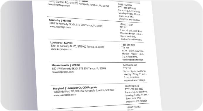 2024 Evidence of Coverage for UnitedHealthcare® Group Medicare Advantage PEBB Complete (PPO) Chapter 2: Important phone numbers and resources 32 Quality Improvement Organization (QIO) – Contact Information Kansas | Livanta BFCC-QIO Program 1-888-755-5580 10820 Guilford RD, STE 202 Annapolis Junction, MD 20701 TTY 1-888-985-9295 www.livantaqio.com 9 a.m. - 5 p.m. local time, Monday - Friday; 11 a.m. - 3 p.m. local time, weekends and holidays Kentucky | KEPRO 1-888-317-0751 5201 W Kennedy BLVD, STE 900 Tampa, FL 33609 TTY 711 www.keproqio.com 9 a.m. - 5 p.m. local time, Monday - Friday; 11 a.m. - 3 p.m. local time, weekends and holidays Louisiana | KEPRO 1-888-315-0636 5201 W Kennedy BLVD, STE 900 Tampa, FL 33609 TTY 711 www.keproqio.com 9 a.m. - 5 p.m. local time, Monday - Friday; 11 a.m. - 3 p.m. local time, weekends and holidays Massachusetts | KEPRO 1-888-319-8452 5201 W Kennedy BLVD, STE 900 Tampa, FL 33609 TTY 711 www.keproqio.com 9 a.m. - 5 p.m. local time, Monday - Friday; 11 a.m. - 3 p.m. local time, weekends and holidays Maryland | Livanta BFCC-QIO Program 1-888-396-4646 10820 Guilford RD, STE 202 Annapolis Junction, MD 20701 TTY 1-888-985-2660 www.livantaqio.com 9 a.m. - 5 p.m. local time, Monday - Friday; 11 a.m. - 3 p.m. local time, weekends and holidays Maine | KEPRO 1-888-319-8452 5201 W Kennedy BLVD, STE 900 Tampa, FL 33609 TTY 711 www.keproqio.com 9 a.m. - 5 p.m. local time, Monday - Friday; 11 a.m. - 3 p.m. local time, weekends and holidays