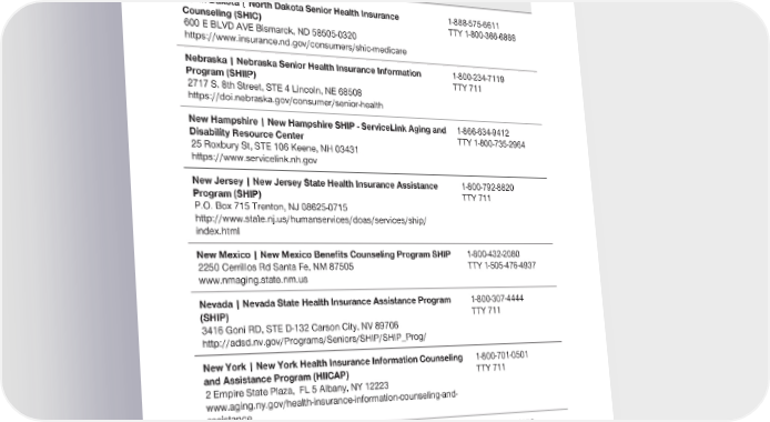 2024 Evidence of Coverage for UnitedHealthcare® Group Medicare Advantage PEBB Complete (PPO) Chapter 2: Important phone numbers and resources 24 State Health Insurance Assistance Programs (SHIP) - Contact Information North Dakota | North Dakota Senior Health Insurance 1-888-575-6611 Counseling (SHIC) TTY 1-800-366-6888 600 E BLVD AVE Bismarck, ND 58505-0320 https://www.insurance.nd.gov/consumers/shic-medicare Nebraska | Nebraska Senior Health Insurance Information 1-800-234-7119 Program (SHIIP) TTY 711 2717 S. 8th Street, STE 4 Lincoln, NE 68508 https://doi.nebraska.gov/consumer/senior-health New Hampshire | New Hampshire SHIP - ServiceLink Aging and 1-866-634-9412 Disability Resource Center TTY 1-800-735-2964 25 Roxbury St, STE 106 Keene, NH 03431 https://www.servicelink.nh.gov New Jersey | New Jersey State Health Insurance Assistance 1-800-792-8820 Program (SHIP) TTY 711 P.O. Box 715 Trenton, NJ 08625-0715 http://www.state.nj.us/humanservices/doas/services/ship/ index.html New Mexico | New Mexico Benefits Counseling Program SHIP 1-800-432-2080 2250 Cerrillos Rd Santa Fe, NM 87505 TTY 1-505-476-4937 www.nmaging.state.nm.us Nevada | Nevada State Health Insurance Assistance Program 1-800-307-4444 (SHIP) TTY 711 3416 Goni RD, STE D-132 Carson City, NV 89706 http://adsd.nv.gov/Programs/Seniors/SHIP/SHIP_Prog/ New York | New York Health Insurance Information Counseling 1-800-701-0501 and Assistance Program (HIICAP) TTY 711 2 Empire State Plaza, FL 5 Albany, NY 12223 www.aging.ny.gov/health-insurance-information-counseling-and- assistance Ohio | Ohio Senior Health Insurance Information Program 1-800-686-1578 (OSHIIP) TTY 1-614-644-3745 50 W Town ST, STE 300, FL 3 Columbus, OH 43215 https://insurance.ohio.gov/wps/portal/gov/odi/consumers