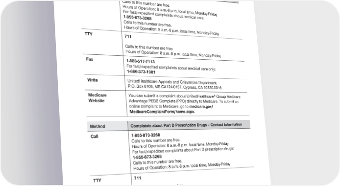 2024 Evidence of Coverage for UnitedHealthcare® Group Medicare Advantage PEBB Complete (PPO) Chapter 2: Important phone numbers and resources 15 Method Complaints about Medical Care – Contact Information Call 1-855-873-3268 Calls to this number are free. Hours of Operation: 8 a.m.-8 p.m. local time, Monday-Friday For fast/expedited complaints about medical care: 1-855-873-3268 Calls to this number are free. Hours of Operation: 8 a.m.-8 p.m. local time, Monday-Friday TTY 711 Calls to this number are free. Hours of Operation: 8 a.m.-8 p.m. local time, Monday-Friday Fax 1-888-517-7113 For fast/expedited complaints about medical care only: 1-866-373-1081 Write UnitedHealthcare Appeals and Grievances Department P.O. Box 6106, MS CA124-0157, Cypress, CA 90630-0016 Medicare You can submit a complaint about UnitedHealthcare® Group Medicare Website Advantage PEBB Complete (PPO) directly to Medicare. To submit an online complaint to Medicare, go to medicare.gov/ MedicareComplaintForm/home.aspx. Method Complaints about Part D Prescription Drugs – Contact Information Call 1-855-873-3268 Calls to this number are free. Hours of Operation: 8 a.m.-8 p.m. local time, Monday-Friday For fast/expedited complaints about Part D prescription drugs: 1-855-873-3268 Calls to this number are free. Hours of Operation: 8 a.m.-8 p.m. local time, Monday-Friday TTY 711 Calls to this number are free. Hours of Operation: 8 a.m.-8 p.m. local time, Monday-Friday Fax For standard Part D prescription drug complaints: 1-866-308-6294 For fast/expedited Part D prescription drug complaints: