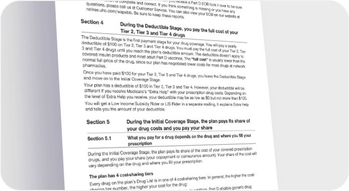 2024 Evidence of Coverage for UnitedHealthcare® Group Medicare Advantage PEBB Complete (PPO) Chapter 6: What you pay for your Part D prescription drugs 165 most charities count toward your out-of-pocket costs. Keep a record of these payments and send them to us so we can track your costs. · Check the written report we send you. When you receive a Part D EOB look it over to be sure the information is complete and correct. If you think something is missing or you have any questions, please call us at Customer Service. You can also view your EOB on our website at retiree.uhc.com/wapebb. Be sure to keep these reports. Section 4 During the Deductible Stage, you pay the full cost of your Tier 2, Tier 3 and Tier 4 drugs The Deductible Stage is the first payment stage for your drug coverage. You will pay a yearly deductible of $100 on Tier 2, Tier 3 and Tier 4 drugs. You must pay the full cost of your Tier 2, Tier 3 and Tier 4 drugs until you reach the plan’s deductible amount. The deductible doesn’t apply to covered insulin products and most adult Part D vaccines. The “full cost” is usually lower than the normal full price of the drug, since our plan has negotiated lower costs for most drugs at network pharmacies. Once you have paid $100 for your Tier 2, Tier 3 and Tier 4 drugs, you leave the Deductible Stage and move on to the Initial Coverage Stage. Your plan has a deductible of $100 in Tier 2, Tier 3 and Tier 4. However, your deductible will be different if you receive Medicare’s “Extra Help” with your prescription drug costs. Depending on the level of Extra Help you receive, your deductible may be as low as $0 but not more than $100. You will get a Low Income Subsidy Rider or LIS Rider in a separate mailing. It explains Extra Help and tells you the amount of your deductible. Section 5 During the Initial Coverage Stage, the plan pays its share of your drug costs and you pay your share Section 5.1 What you pay for a drug depends on the drug and where you fill your prescription During the Initial Coverage Stage, the plan pays its share of the cost of your covered prescription drugs, and you pay your share (your copayment or coinsurance amount). Your share of the cost will vary depending on the drug and where you fill your prescription. The plan has 4 cost-sharing tiers Every drug on the plan’s Drug List is in one of 4 cost-sharing tiers. In general, the higher the cost- sharing tier number, the higher your cost for the drug: Tier 1 – Preferred Generic - All covered generic drugs. In addition, Part D eligible generic drug compound medications are covered in Tier 1. This is the lowest cost-sharing tier. Tier 2 – Preferred Brand - Many common brand name drugs, called preferred brands. Tier 3 – Non-preferred Drug - Non-preferred brand name drugs. In addition, Part D eligible compound medications are covered in Tier 3.