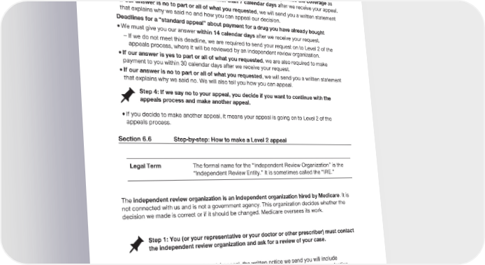 2024 Evidence of Coverage for UnitedHealthcare® Group Medicare Advantage PEBB Complete (PPO) Chapter 9: What to do if you have a problem or complaint (coverage decisions, appeals, complaints) 212 · If our answer is yes to part or all of what you requested, we must provide the coverage as quickly as your health requires, but no later than 7 calendar days after we receive your appeal. · If our answer is no to part or all of what you requested, we will send you a written statement that explains why we said no and how you can appeal our decision. Deadlines for a “standard appeal” about payment for a drug you have already bought · We must give you our answer within 14 calendar days after we receive your request. - If we do not meet this deadline, we are required to send your request on to Level 2 of the appeals process, where it will be reviewed by an independent review organization. · If our answer is yes to part or all of what you requested, we are also required to make payment to you within 30 calendar days after we receive your request. · If our answer is no to part or all of what you requested, we will send you a written statement that explains why we said no. We will also tell you how you can appeal. Step 4: If we say no to your appeal, you decide if you want to continue with the appeals process and make another appeal. · If you decide to make another appeal, it means your appeal is going on to Level 2 of the appeals process. Section 6.6 Step-by-step: How to make a Level 2 appeal Legal Term The formal name for the “Independent Review Organization” is the “Independent Review Entity.” It is sometimes called the “IRE.” The independent review organization is an independent organization hired by Medicare. It is not connected with us and is not a government agency. This organization decides whether the decision we made is correct or if it should be changed. Medicare oversees its work. Step 1: You (or your representative or your doctor or other prescriber) must contact the independent review organization and ask for a review of your case. · If our plan says no to your Level 1 appeal, the written notice we send you will include instructions on how to make a Level 2 appeal with the independent review organization. These instructions will tell who can make this Level 2 appeal, what deadlines you must follow, and how to reach the review organization. If, however, we did not complete our review within the applicable timeframe, or make an unfavorable decision regarding “at-risk” determination under our drug management program, we will automatically forward your claim to the IRE.