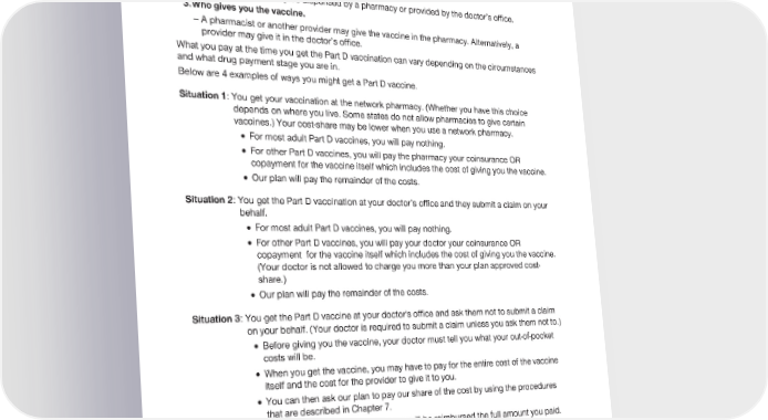 2024 Evidence of Coverage for UnitedHealthcare® Group Medicare Advantage PEBB Complete (PPO) Chapter 6: What you pay for your Part D prescription drugs 170 - Most adult Part D vaccinations are recommended by ACIP and cost you nothing. 2. Where you get the vaccine. - The vaccine itself may be dispensed by a pharmacy or provided by the doctor’s office. 3. Who gives you the vaccine. - A pharmacist or another provider may give the vaccine in the pharmacy. Alternatively, a provider may give it in the doctor’s office. What you pay at the time you get the Part D vaccination can vary depending on the circumstances and what drug payment stage you are in. Below are 4 examples of ways you might get a Part D vaccine. Situation 1: You get your vaccination at the network pharmacy. (Whether you have this choice depends on where you live. Some states do not allow pharmacies to give certain vaccines.) Your cost-share may be lower when you use a network pharmacy. · For most adult Part D vaccines, you will pay nothing. · For other Part D vaccines, you will pay the pharmacy your coinsurance OR copayment for the vaccine itself which includes the cost of giving you the vaccine. · Our plan will pay the remainder of the costs. Situation 2: You get the Part D vaccination at your doctor’s office and they submit a claim on your behalf. · For most adult Part D vaccines, you will pay nothing. · For other Part D vaccines, you will pay your doctor your coinsurance OR copayment for the vaccine itself which includes the cost of giving you the vaccine. (Your doctor is not allowed to charge you more than your plan approved cost- share.) · Our plan will pay the remainder of the costs. Situation 3: You get the Part D vaccine at your doctor's office and ask them not to submit a claim on your behalf. (Your doctor is required to submit a claim unless you ask them not to.) · Before giving you the vaccine, your doctor must tell you what your out-of-pocket costs will be. · When you get the vaccine, you may have to pay for the entire cost of the vaccine itself and the cost for the provider to give it to you. · You can then ask our plan to pay our share of the cost by using the procedures that are described in Chapter 7. · For most adult Part D vaccines, you will be reimbursed the full amount you paid. For other Part D vaccines, you will be reimbursed the amount you paid less your normal coinsurance OR copayment for the vaccine (including administration), and less any difference between the amount the doctor charges and what we normally pay. (If you get “Extra Help,” we will reimburse you for this difference.)