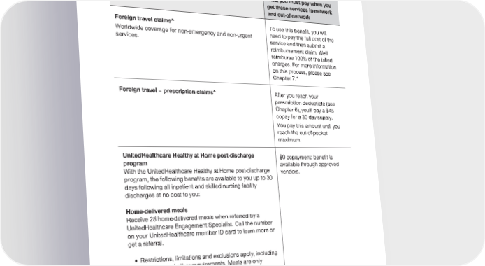 2024 Evidence of Coverage for UnitedHealthcare® Group Medicare Advantage PEBB Complete (PPO) Chapter 4: Medical Benefits Chart (what is covered and what you pay) 89 Services that are covered for you What you must pay when you get these services in-network and out-of-network Foreign travel claims^ To use this benefit, you will Worldwide coverage for non-emergency and non-urgent need to pay the full cost of the services. service and then submit a reimbursement claim. We'll reimburse 100% of the billed charges. For more information on this process, please see Chapter 7.* Foreign travel – prescription claims^ After you reach your prescription deductible (see Chapter 6), you'll pay a $45 copay for a 30 day supply. You pay this amount until you reach the out-of-pocket maximum. UnitedHealthcare Healthy at Home post-discharge $0 copayment; benefit is program available through approved With the UnitedHealthcare Healthy at Home post-discharge vendors. program, the following benefits are available to you up to 30 days following all inpatient and skilled nursing facility discharges at no cost to you: Home-delivered meals Receive 28 home-delivered meals when referred by a UnitedHealthcare Engagement Specialist. Call the number on your UnitedHealthcare member ID card to learn more or get a referral. · Restrictions, limitations and exclusions apply, including shipping and other requirements. Meals are only available through the approved vendor · If you have been recently discharged from the hospital or a skilled nursing facility and would like a referral, call