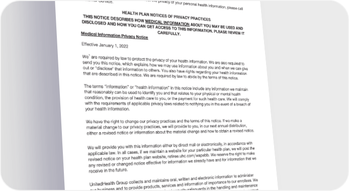 2024 Evidence of Coverage for UnitedHealthcare® Group Medicare Advantage PEBB Complete (PPO) Chapter 8: Your rights and responsibilities 180 You have the right to know how your health information has been shared with others for any purposes that are not routine. If you have questions or concerns about the privacy of your personal health information, please call Customer Service. HEALTH PLAN NOTICES OF PRIVACY PRACTICES THIS NOTICE DESCRIBES HOW MEDICAL INFORMATION ABOUT YOU MAY BE USED AND DISCLOSED AND HOW YOU CAN GET ACCESS TO THIS INFORMATION. PLEASE REVIEW IT CAREFULLY. Medical Information Privacy Notice Effective January 1, 2022 1 We are required by law to protect the privacy of your health information. We are also required to send you this notice, which explains how we may use information about you and when we can give out or "disclose" that information to others. You also have rights regarding your health information that are described in this notice. We are required by law to abide by the terms of this notice. The terms “information” or “health information” in this notice include any information we maintain that reasonably can be used to identify you and that relates to your physical or mental health condition, the provision of health care to you, or the payment for such health care. We will comply with the requirements of applicable privacy laws related to notifying you in the event of a breach of your health information. We have the right to change our privacy practices and the terms of this notice. If we make a material change to our privacy practices, we will provide to you, in our next annual distribution, either a revised notice or information about the material change and how to obtain a revised notice. We will provide you with this information either by direct mail or electronically, in accordance with applicable law. In all cases, if we maintain a website for your particular health plan, we will post the revised notice on your health plan website, retiree.uhc.com/wapebb. We reserve the right to make any revised or changed notice effective for information we already have and for information that we receive in the future. UnitedHealth Group collects and maintains oral, written and electronic information to administer our business and to provide products, services and information of importance to our enrollees. We maintain physical, electronic and procedural security safeguards in the handling and maintenance of our enrollees’ information, in accordance with applicable state and federal standards, to protect against risks such as loss, destruction or misuse. How We Collect, Use, and Disclose Information