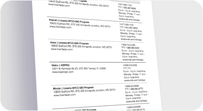 2024 Evidence of Coverage for UnitedHealthcare® Group Medicare Advantage PEBB Complete (PPO) Chapter 2: Important phone numbers and resources 31 Quality Improvement Organization (QIO) – Contact Information Guam | Livanta BFCC-QIO Program 1-877-588-1123 10820 Guilford RD, STE 202 Annapolis Junction, MD 20701 TTY 1-855-887-6668 www.livantaqio.com 9 a.m. - 5 p.m. local time, Monday - Friday; 11 a.m. - 3 p.m. local time, weekends and holidays Hawaii | Livanta BFCC-QIO Program 1-877-588-1123 10820 Guilford RD, STE 202 Annapolis Junction, MD 20701 TTY 1-855-887-6668 www.livantaqio.com 9 a.m. - 5 p.m. local time, Monday - Friday; 11 a.m. - 3 p.m. local time, weekends and holidays Iowa | Livanta BFCC-QIO Program 1-888-755-5580 10820 Guilford RD, STE 202 Annapolis Junction, MD 20701 TTY 1-888-985-9295 www.livantaqio.com 9 a.m. - 5 p.m. local time, Monday - Friday; 11 a.m. - 3 p.m. local time, weekends and holidays Idaho | KEPRO 1-888-315-0636 5201 W Kennedy BLVD, STE 900 Tampa, FL 33609 TTY 711 www.keproqio.com 9 a.m. - 5 p.m. local time, Monday - Friday; 11 a.m. - 3 p.m. local time, weekends and holidays Illinois | Livanta BFCC-QIO Program 1-888-524-9900 10820 Guilford RD, STE 202 Annapolis Junction, MD 20701 TTY 1-888-985-8775 www.livantaqio.com 9 a.m. - 5 p.m. local time, Monday - Friday; 11 a.m. - 3 p.m. local time, weekends and holidays Indiana | Livanta BFCC-QIO Program 1-888-524-9900 10820 Guilford RD, STE 202 Annapolis Junction, MD 20701 TTY 1-888-985-8775 www.livantaqio.com 9 a.m. - 5 p.m. local time, Monday - Friday; 11 a.m. - 3 p.m. local time, weekends and holidays