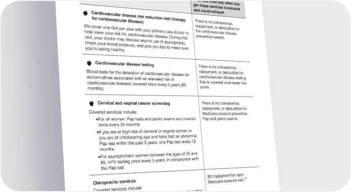 2024 Evidence of Coverage for UnitedHealthcare® Group Medicare Advantage PEBB Complete (PPO) Chapter 4: Medical Benefits Chart (what is covered and what you pay) 81 Services that are covered for you What you must pay when you get these services in-network and out-of-network There is no coinsurance, Cardiovascular disease risk reduction visit (therapy for cardiovascular disease) copayment, or deductible for We cover one visit per year with your primary care doctor to the cardiovascular disease help lower your risk for cardiovascular disease. During this preventive benefit. visit, your doctor may discuss aspirin use (if appropriate), check your blood pressure, and give you tips to make sure you’re eating healthy. There is no coinsurance, Cardiovascular disease testing copayment, or deductible for Blood tests for the detection of cardiovascular disease (or cardiovascular disease testing abnormalities associated with an elevated risk of that is covered once every five cardiovascular disease) covered once every 5 years (60 years. months). There is no coinsurance, Cervical and vaginal cancer screening copayment, or deductible for Covered services include: Medicare-covered preventive · For all women: Pap tests and pelvic exams are covered Pap and pelvic exams. once every 24 months · If you are at high risk of cervical or vaginal cancer or you are of childbearing age and have had an abnormal Pap test within the past 3 years: one Pap test every 12 months · For asymptomatic women between the ages of 30 and 65: HPV testing once every 5 years, in conjunction with the Pap test Chiropractic services $0 copayment for each Medicare-covered visit.†† Covered services include: · Manual manipulation of the spine to correct subluxation (when one or more of the bones of your spine move out of position). Manual manipulation is a treatment that