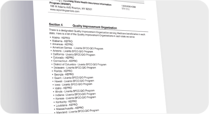 2024 Evidence of Coverage for UnitedHealthcare® Group Medicare Advantage PEBB Complete (PPO) Chapter 2: Important phone numbers and resources 27 State Health Insurance Assistance Programs (SHIP) - Contact Information Wyoming | Wyoming State Health Insurance Information 1-800-856-4398 Program (WSHIIP) TTY 711 106 W Adams AVE Riverton, WY 82501 www.wyomingseniors.com Section 4 Quality Improvement Organization There is a designated Quality Improvement Organization serving Medicare beneficiaries in each state. Here is a list of the Quality Improvement Organizations in each state we serve: • Alaska - KEPRO • Alabama - KEPRO • Arkansas - KEPRO • American Samoa - Livanta BFCC-QIO Program • Arizona - Livanta BFCC-QIO Program • California - Livanta BFCC-QIO Program • Colorado - KEPRO • Connecticut - KEPRO • District of Columbia - Livanta BFCC-QIO Program • Delaware - Livanta BFCC-QIO Program • Florida - KEPRO • Georgia - KEPRO • Guam - Livanta BFCC-QIO Program • Hawaii - Livanta BFCC-QIO Program • Iowa - Livanta BFCC-QIO Program • Idaho - KEPRO • Illinois - Livanta BFCC-QIO Program • Indiana - Livanta BFCC-QIO Program • Kansas - Livanta BFCC-QIO Program • Kentucky - KEPRO • Louisiana - KEPRO • Massachusetts - KEPRO • Maryland - Livanta BFCC-QIO Program • Maine - KEPRO • Michigan - Livanta BFCC-QIO Program • Minnesota - Livanta BFCC-QIO Program • Missouri - Livanta BFCC-QIO Program • Northern Mariana Islands - Livanta BFCC-QIO Program • Mississippi - KEPRO • Montana - KEPRO