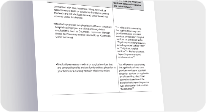 2024 Evidence of Coverage for UnitedHealthcare® Group Medicare Advantage PEBB Complete (PPO) Chapter 4: Medical Benefits Chart (what is covered and what you pay) 116 Services that are covered for you What you must pay when you get these services in-network and out-of-network connection with care, treatment, filling, removal, or replacement of teeth or structures directly supporting the teeth are not Medicare-covered benefits and not covered under this benefit. · Monitoring services in a physician’s office or outpatient You will pay the cost-sharing hospital setting if you are taking anticoagulation that applies to primary care medications, such as Coumadin, Heparin or Warfarin provider services, specialist (these services may also be referred to as ‘Coumadin services, or outpatient hospital Clinic’ services). services (as described under “Physician/practitioner services, including doctor’s office visits” or “Outpatient hospital services” in this benefit chart) depending on where you †† receive services. · Medically-necessary medical or surgical services that You will pay the cost-sharing are covered benefits and are furnished by a physician in that applies to primary care your home or a nursing home in which you reside. provider services or specialist physician services (as applied in an office setting, described above in this section of the benefit chart) depending on the type of physician that provides †† the services.
