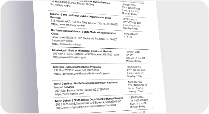 2024 Evidence of Coverage for UnitedHealthcare® Group Medicare Advantage PEBB Complete (PPO) Chapter 2: Important phone numbers and resources 43 State Medicaid Programs – Contact Information Minnesota | Minnesota Department of Human Services 1-800-657-3739 P.O. Box 64989 St. Paul, MN 55164-0989 TTY 1-800-627-3529 http://mn.gov/dhs 8 a.m. - 5 p.m. CT, Monday - Friday Missouri | MO HealthNet Division Department of Social 1-573-526-4274 Services TTY 1-800-735-2966 615 Howerton CT, P.O. Box 6500 Jefferson City, MO 65102-6500 8 a.m. - 5 p.m. CT, https://www.dss.mo.gov/mhd/ Monday - Friday Northern Mariana Islands | State Medicaid Administration 1-670-664-4880 Office TTY 711 Government BLDG # 1252, Capital Hill RD, Caller Box 100007 Saipan, MP 96950 http://medicaid.cnmi.mp/ Mississippi | State of Mississippi Division of Medicaid 1-800-421-2408 550 High ST STE, 1000 Sillers BLDG Jackson, MS 39201-1399 TTY 711 http://www.medicaid.ms.gov/ 7:30 a.m. - 5 p.m. CT, Monday - Friday Montana | Montana Healthcare Programs 1-888-362-8312 P.O. Box 202951 Helena, MT 59620-2951 TTY 1-800-833-8503 https://dphhs.mt.gov/MontanaHealthcarePrograms 8 a.m. - 5 p.m. MT, Monday - Friday North Carolina | North Carolina Deparment of Health and 1-800-662-7030 Human Services TTY 1-888-232-6348 2001 Mail Service Center Raleigh, NC 27699-2501 8 a.m. - 5 p.m. ET, https://www.ncdhhs.gov/ Monday - Friday North Dakota | North Dakota Department of Human Services 1-800-755-2604 600 E BLVD AVE, Department 325 Bismarck, ND 58505-0250 TTY 1-800-366-6888 http://www.nd.gov/dhs/services/medicalserv/medicaid 8 a.m. - 5 p.m. CT, Monday - Friday Nebraska | Nebraska Department of Health and Human 1-402-471-3121 Services TTY 1-800-471-7352 P.O. Box 95026 Lincoln, NE 68509-5026 8 a.m. - 5 p.m. CT, dhhs.ne.gov/Pages/medicaid-and-long-term-care.aspx Monday - Friday