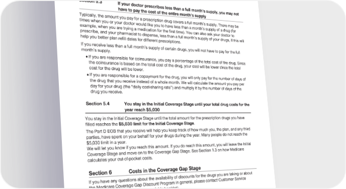 2024 Evidence of Coverage for UnitedHealthcare® Group Medicare Advantage PEBB Complete (PPO) Chapter 6: What you pay for your Part D prescription drugs 168 Please see Section 9 of this chapter for more information on Part D vaccines and cost sharing for Part D vaccines. Section 5.3 If your doctor prescribes less than a full month’s supply, you may not have to pay the cost of the entire month’s supply Typically, the amount you pay for a prescription drug covers a full month’s supply. There may be times when you or your doctor would like you to have less than a month’s supply of a drug (for example, when you are trying a medication for the first time). You can also ask your doctor to prescribe, and your pharmacist to dispense, less than a full month’s supply of your drugs, if this will help you better plan refill dates for different prescriptions. If you receive less than a full month’s supply of certain drugs, you will not have to pay for the full month’s supply. · If you are responsible for coinsurance, you pay a percentage of the total cost of the drug. Since the coinsurance is based on the total cost of the drug, your cost will be lower since the total cost for the drug will be lower. · If you are responsible for a copayment for the drug, you will only pay for the number of days of the drug that you receive instead of a whole month. We will calculate the amount you pay per day for your drug (the “daily cost-sharing rate”) and multiply it by the number of days of the drug you receive. Section 5.4 You stay in the Initial Coverage Stage until your total drug costs for the year reach $5,030 You stay in the Initial Coverage Stage until the total amount for the prescription drugs you have filled reaches the $5,030 limit for the Initial Coverage Stage. The Part D EOB that you receive will help you keep track of how much you, the plan, and any third parties, have spent on your behalf for your drugs during the year. Many people do not reach the $5,030 limit in a year. We will let you know if you reach this amount. If you do reach this amount, you will leave the Initial Coverage Stage and move on to the Coverage Gap Stage. See Section 1.3 on how Medicare calculates your out-of-pocket costs. Section 6 Costs in the Coverage Gap Stage If you have any questions about the availability of discounts for the drugs you are taking or about the Medicare Coverage Gap Discount Program in general, please contact Customer Service (phone numbers are on the cover of this booklet). After you leave the Initial Coverage Stage, we will continue to pay our share of the cost of your drugs and you pay your share of the cost. You pay these amounts until your yearly out-of-pocket costs reach a maximum amount that Medicare has set. In 2024, that amount is $8,000. Medicare has rules about what counts and what does not count toward your out-of-pocket costs (Section 1.3).