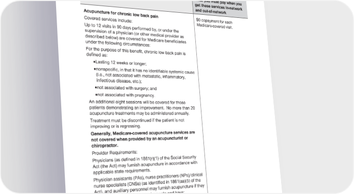 2024 Evidence of Coverage for UnitedHealthcare® Group Medicare Advantage PEBB Complete (PPO) Chapter 4: Medical Benefits Chart (what is covered and what you pay) 77 Services that are covered for you What you must pay when you get these services in-network and out-of-network Acupuncture for chronic low back pain $0 copayment for each Covered services include: Medicare-covered visit. Up to 12 visits in 90 days performed by, or under the supervision of a physician (or other medical provider as described below) are covered for Medicare beneficiaries under the following circumstances: For the purpose of this benefit, chronic low back pain is defined as: · Lasting 12 weeks or longer; · nonspecific, in that it has no identifiable systemic cause (i.e., not associated with metastatic, inflammatory, infectious disease, etc.); · not associated with surgery; and · not associated with pregnancy. An additional eight sessions will be covered for those patients demonstrating an improvement. No more than 20 acupuncture treatments may be administered annually. Treatment must be discontinued if the patient is not improving or is regressing. Generally, Medicare-covered acupuncture services are not covered when provided by an acupuncturist or chiropractor. Provider Requirements: Physicians (as defined in 1861(r)(1) of the Social Security Act (the Act) may furnish acupuncture in accordance with applicable state requirements. Physician assistants (PAs), nurse practitioners (NPs)/clinical nurse specialists (CNSs) (as identified in 1861(aa)(5) of the Act), and auxiliary personnel may furnish acupuncture if they meet all applicable state requirements and have: · a masters or doctoral level degree in acupuncture or Oriental Medicine from a school accredited by the