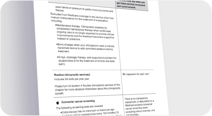 2024 Evidence of Coverage for UnitedHealthcare® Group Medicare Advantage PEBB Complete (PPO) Chapter 4: Medical Benefits Chart (what is covered and what you pay) 82 Services that are covered for you What you must pay when you get these services in-network and out-of-network uses hands-on pressure to gently move your joints and tissues. Excluded from Medicare coverage is any service other than manual manipulation for the treatment of subluxation, including: · Maintenance therapy. Chiropractic treatment is considered maintenance therapy when continuous ongoing care is no longer expected to provide clinical improvements and the treatment becomes supportive instead of corrective. · Extra charges when your chiropractor uses a manual, hand-held device to add controlled pressure during treatment. · X-rays, massage therapy, and acupuncture (unless the acupuncture is for the treatment of chronic low back pain). Routine chiropractic services‡ $0 copayment for each visit* Includes 24 visits per plan year. Please turn to Section 4 Routine chiropractic services of this chapter for more detailed information about this chiropractic benefit. There is no coinsurance, Colorectal cancer screening copayment, or deductible for a The following screening tests are covered: Medicare-covered colorectal · Colonoscopy has no minimum or maximum age cancer screening exam, limitation and is covered once every 120 months (10 excluding barium enemas, and years) for patients not at high risk, or 48 months after a colonoscopy. previous flexible sigmoidoscopy for patients who are There is no coinsurance, not at high risk for colorectal cancer, and once every 24 copayment, or deductible for