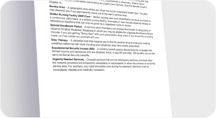 2024 Evidence of Coverage for UnitedHealthcare® Group Medicare Advantage PEBB Complete (PPO) Chapter 12: Definitions of important words 255 and occupational therapy. Retail Walk-In Clinic – A provider location that generally does not require appointments and may be a standalone location or located in a retail store, supermarket or pharmacy. Walk-In Clinic Services are subject to the same cost-sharing as Urgent Care Centers. (See the Benefit Chart in Chapter 4) Service Area – A geographic area where you must live to join a particular health plan. The plan may disenroll you if you permanently move out of the plan’s service area. Skilled Nursing Facility (SNF) Care – Skilled nursing care and rehabilitation services provided on a continuous, daily basis, in a skilled nursing facility. Examples of care include physical therapy or intravenous injections that can only be given by a registered nurse or doctor. Special Enrollment Period – A set time when members can change their health or drug plans or return to Original Medicare. Situations in which you may be eligible for a Special Enrollment Period include: if you are getting “Extra Help” with your prescription drug costs, if you move into a nursing home, or if we violate our contract with you. Step Therapy – A utilization tool that requires you to first try another drug to treat your medical condition before we will cover the drug your physician may have initially prescribed. Supplemental Security Income (SSI) – A monthly benefit paid by Social Security to people with limited income and resources who are disabled, blind, or age 65 and older. SSI benefits are not the same as Social Security benefits. Urgently Needed Services – Covered services that are not emergency services, provided when the network providers are temporarily unavailable or inaccessible or when the enrollee is out of the service area. For example, you need immediate care during the weekend. Services must be immediately needed and medically necessary.