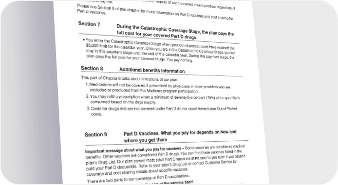 2024 Evidence of Coverage for UnitedHealthcare® Group Medicare Advantage PEBB Complete (PPO) Chapter 6: What you pay for your Part D prescription drugs 169 Coverage Gap Stage coinsurance requirements do not apply to Part D covered insulin products and most adult Part D vaccines. You won’t pay more than $35 for a one-month supply of each covered insulin product regardless of the cost-sharing tier. Please see Section 9 of this chapter for more information on Part D vaccines and cost sharing for Part D vaccines. Section 7 During the Catastrophic Coverage Stage, the plan pays the full cost for your covered Part D drugs · You enter the Catastrophic Coverage Stage when your out-of-pocket costs have reached the $8,000 limit for the calendar year. Once you are in the Catastrophic Coverage Stage, you will stay in this payment stage until the end of the calendar year. During this payment stage, the plan pays the full cost for your covered drugs. You pay nothing. Section 8 Additional benefits information This part of Chapter 6 talks about limitations of our plan. 1. Medications will not be covered if prescribed by physicians or other providers who are excluded or precluded from the Medicare program participation. 2. You may refill a prescription when a minimum of seventy-five percent (75%) of the quantity is consumed based on the days supply. 3. Costs for drugs that are not covered under Part D do not count toward your Out-of-Pocket costs. Section 9 Part D Vaccines. What you pay for depends on how and where you get them Important message about what you pay for vaccines – Some vaccines are considered medical benefits. Other vaccines are considered Part D drugs. You can find these vaccines listed in the plan’s Drug List. Our plan covers most adult Part D vaccines at no cost to you even if you haven’t paid your Part D deductible. Refer to your plan’s Drug List or contact Customer Service for coverage and cost sharing details about specific vaccines. There are two parts to our coverage of Part D vaccinations: · The first part of coverage is the cost of the vaccine itself. The second part of coverage is for the cost of . (This is sometimes · giving you the vaccine called the “administration” of the vaccine.) Your costs for a Part D vaccination depend on three things: 1. Whether the vaccine is recommended for adults by an organization called the Advisory Committee on Immunization Practices (ACIP).