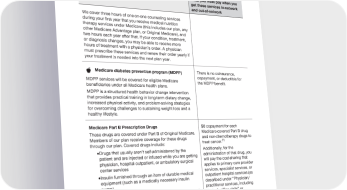 2024 Evidence of Coverage for UnitedHealthcare® Group Medicare Advantage PEBB Complete (PPO) Chapter 4: Medical Benefits Chart (what is covered and what you pay) 101 Services that are covered for you What you must pay when you get these services in-network and out-of-network We cover three hours of one-on-one counseling services during your first year that you receive medical nutrition therapy services under Medicare (this includes our plan, any other Medicare Advantage plan, or Original Medicare), and two hours each year after that. If your condition, treatment, or diagnosis changes, you may be able to receive more hours of treatment with a physician’s order. A physician must prescribe these services and renew their order yearly if your treatment is needed into the next plan year. There is no coinsurance, Medicare diabetes prevention program (MDPP) copayment, or deductible for MDPP services will be covered for eligible Medicare the MDPP benefit. beneficiaries under all Medicare health plans. MDPP is a structured health behavior change intervention that provides practical training in long-term dietary change, increased physical activity, and problem-solving strategies for overcoming challenges to sustaining weight loss and a healthy lifestyle. Medicare Part B Prescription Drugs $0 copayment for each These drugs are covered under Part B of Original Medicare. Medicare-covered Part B drug Members of our plan receive coverage for these drugs and non-chemotherapy drugs to treat cancer.†† through our plan. Covered drugs include: · Drugs that usually aren’t self-administered by the Additionally, for the patient and are injected or infused while you are getting administration of that drug, you physician, hospital outpatient, or ambulatory surgical will pay the cost-sharing that center services applies to primary care provider · Insulin furnished through an item of durable medical services, specialist services, or equipment (such as a medically necessary insulin outpatient hospital services (as pump) described under “Physician/ practitioner services, including · Other drugs you take using durable medical equipment doctor’s office visits” or (such as nebulizers) that were authorized by the plan “Outpatient hospital services” in this benefit chart) depending on