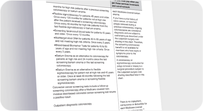 2024 Evidence of Coverage for UnitedHealthcare® Group Medicare Advantage PEBB Complete (PPO) Chapter 4: Medical Benefits Chart (what is covered and what you pay) 83 Services that are covered for you What you must pay when you get these services in-network and out-of-network months for high risk patients after a previous screening each Medicare-covered barium colonoscopy or barium enema. enema. · Flexible sigmoidoscopy for patients 45 years and older. If you have a prior history of Once every 120 months for patients not at high risk colon cancer, or have had after the patient received a screening colonoscopy. polyps removed during a Once every 48 months for high risk patients from the previous colonoscopy, ongoing last flexible sigmoidoscopy or barium enema. colonoscopies are considered · Screening fecal-occult blood tests for patients 45 years diagnostic and are subject to and older. Once every 12 months. cost-sharing as described under · Multitarget stool DNA for patients 45 to 85 years of age the outpatient surgery cost- and not meeting high risk criteria. Once every 3 years. sharing in this chart. Therefore, the screening colonoscopy · Blood-based Biomarker Tests for patients 45 to 85 benefit is not available for years of age and not meeting high risk criteria. Once members who have signs or every 3 years. symptoms prior to the · Barium Enema as an alternative to colonoscopy for colonoscopy. patients at high risk and 24 months since the last A colonoscopy or screening barium enema or the last screening sigmoidoscopy conducted for colonoscopy. polyp removal or biopsy is a · Barium Enema as an alternative to flexible surgical procedure subject to sigmoidoscopy for patient not at high risk and 45 years the outpatient surgery cost- or older. Once at least 48 months following the last sharing described later in this screening barium enema or screening flexible chart. sigmoidoscopy. Colorectal cancer screening tests include a follow-up screening colonoscopy after a Medicare covered non- invasive stool-based colorectal cancer screening test returns a positive result. Outpatient diagnostic colonoscopy There is no copayment, coinsurance or deductible for each Medicare-covered diagnostic colonoscopy.††