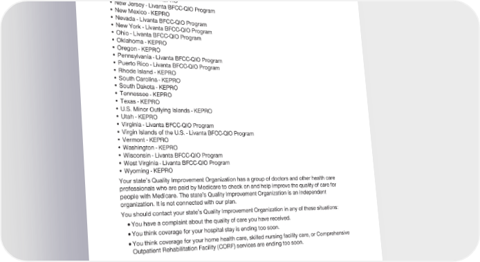 2024 Evidence of Coverage for UnitedHealthcare® Group Medicare Advantage PEBB Complete (PPO) Chapter 2: Important phone numbers and resources 28 • North Carolina - KEPRO • North Dakota - KEPRO • Nebraska - Livanta BFCC-QIO Program • New Hampshire - KEPRO • New Jersey - Livanta BFCC-QIO Program • New Mexico - KEPRO • Nevada - Livanta BFCC-QIO Program • New York - Livanta BFCC-QIO Program • Ohio - Livanta BFCC-QIO Program • Oklahoma - KEPRO • Oregon - KEPRO • Pennsylvania - Livanta BFCC-QIO Program • Puerto Rico - Livanta BFCC-QIO Program • Rhode Island - KEPRO • South Carolina - KEPRO • South Dakota - KEPRO • Tennessee - KEPRO • Texas - KEPRO • U.S. Minor Outlying Islands - KEPRO • Utah - KEPRO • Virginia - Livanta BFCC-QIO Program • Virgin Islands of the U.S. - Livanta BFCC-QIO Program • Vermont - KEPRO • Washington - KEPRO • Wisconsin - Livanta BFCC-QIO Program • West Virginia - Livanta BFCC-QIO Program • Wyoming - KEPRO Your state’s Quality Improvement Organization has a group of doctors and other health care professionals who are paid by Medicare to check on and help improve the quality of care for people with Medicare. The state’s Quality Improvement Organization is an independent organization. It is not connected with our plan. You should contact your state’s Quality Improvement Organization in any of these situations: · You have a complaint about the quality of care you have received. · You think coverage for your hospital stay is ending too soon. · You think coverage for your home health care, skilled nursing facility care, or Comprehensive Outpatient Rehabilitation Facility (CORF) services are ending too soon.