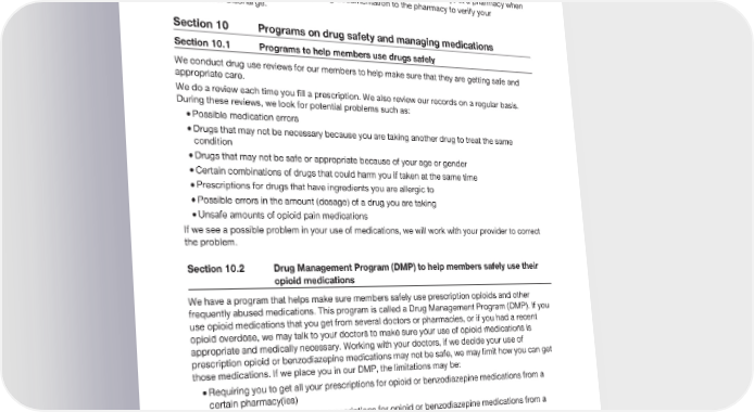2024 Evidence of Coverage for UnitedHealthcare® Group Medicare Advantage PEBB Complete (PPO) Chapter 5: Using the plan’s coverage for Part D prescription drugs 158 In the event you either revoke your hospice election or are discharged from hospice, our plan should cover your drugs as explained in this document. To prevent any delays at a pharmacy when your Medicare hospice benefit ends, bring documentation to the pharmacy to verify your revocation or discharge. Section 10 Programs on drug safety and managing medications Section 10.1 Programs to help members use drugs safely We conduct drug use reviews for our members to help make sure that they are getting safe and appropriate care. We do a review each time you fill a prescription. We also review our records on a regular basis. During these reviews, we look for potential problems such as: · Possible medication errors · Drugs that may not be necessary because you are taking another drug to treat the same condition · Drugs that may not be safe or appropriate because of your age or gender · Certain combinations of drugs that could harm you if taken at the same time · Prescriptions for drugs that have ingredients you are allergic to · Possible errors in the amount (dosage) of a drug you are taking · Unsafe amounts of opioid pain medications If we see a possible problem in your use of medications, we will work with your provider to correct the problem. Section 10.2 Drug Management Program (DMP) to help members safely use their opioid medications We have a program that helps make sure members safely use prescription opioids and other frequently abused medications. This program is called a Drug Management Program (DMP). If you use opioid medications that you get from several doctors or pharmacies, or if you had a recent opioid overdose, we may talk to your doctors to make sure your use of opioid medications is appropriate and medically necessary. Working with your doctors, if we decide your use of prescription opioid or benzodiazepine medications may not be safe, we may limit how you can get those medications. If we place you in our DMP, the limitations may be: · Requiring you to get all your prescriptions for opioid or benzodiazepine medications from a certain pharmacy(ies) · Requiring you to get all your prescriptions for opioid or benzodiazepine medications from a certain doctor(s) · Limiting the amount of opioid or benzodiazepine medications we will cover for you If we plan on limiting how you may get these medications or how much you can get, we will send you a letter in advance. The letter will tell you if we will limit coverage of these drugs for you, or if you’ll be required to get the prescriptions for these drugs only from a specific doctor or pharmacy.