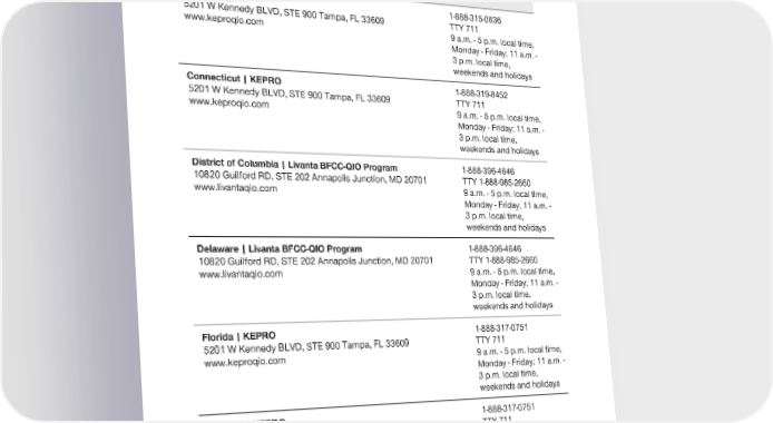 2024 Evidence of Coverage for UnitedHealthcare® Group Medicare Advantage PEBB Complete (PPO) Chapter 2: Important phone numbers and resources 30 Quality Improvement Organization (QIO) – Contact Information Colorado | KEPRO 1-888-315-0636 5201 W Kennedy BLVD, STE 900 Tampa, FL 33609 TTY 711 www.keproqio.com 9 a.m. - 5 p.m. local time, Monday - Friday; 11 a.m. - 3 p.m. local time, weekends and holidays Connecticut | KEPRO 1-888-319-8452 5201 W Kennedy BLVD, STE 900 Tampa, FL 33609 TTY 711 www.keproqio.com 9 a.m. - 5 p.m. local time, Monday - Friday; 11 a.m. - 3 p.m. local time, weekends and holidays District of Columbia | Livanta BFCC-QIO Program 1-888-396-4646 10820 Guilford RD, STE 202 Annapolis Junction, MD 20701 TTY 1-888-985-2660 www.livantaqio.com 9 a.m. - 5 p.m. local time, Monday - Friday; 11 a.m. - 3 p.m. local time, weekends and holidays Delaware | Livanta BFCC-QIO Program 1-888-396-4646 10820 Guilford RD, STE 202 Annapolis Junction, MD 20701 TTY 1-888-985-2660 www.livantaqio.com 9 a.m. - 5 p.m. local time, Monday - Friday; 11 a.m. - 3 p.m. local time, weekends and holidays Florida | KEPRO 1-888-317-0751 5201 W Kennedy BLVD, STE 900 Tampa, FL 33609 TTY 711 www.keproqio.com 9 a.m. - 5 p.m. local time, Monday - Friday; 11 a.m. - 3 p.m. local time, weekends and holidays Georgia | KEPRO 1-888-317-0751 5201 W Kennedy BLVD, STE 900 Tampa, FL 33609 TTY 711 www.keproqio.com 9 a.m. - 5 p.m. local time, Monday - Friday; 11 a.m. - 3 p.m. local time, weekends and holidays