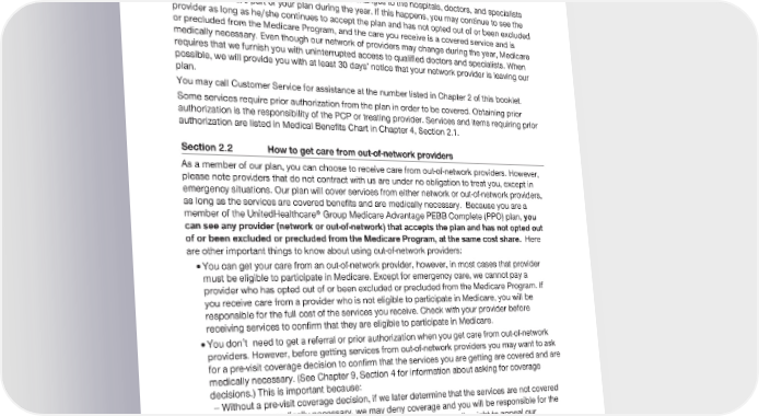 2024 Evidence of Coverage for UnitedHealthcare® Group Medicare Advantage PEBB Complete (PPO) Chapter 3: Using the plan for your medical services 64 What if a specialist or another network provider leaves our plan? It is important that you know that we may make changes to the hospitals, doctors, and specialists (providers) that are part of your plan during the year. If this happens, you may continue to see the provider as long as he/she continues to accept the plan and has not opted out of or been excluded or precluded from the Medicare Program, and the care you receive is a covered service and is medically necessary. Even though our network of providers may change during the year, Medicare requires that we furnish you with uninterrupted access to qualified doctors and specialists. When possible, we will provide you with at least 30 days’ notice that your network provider is leaving our plan. You may call Customer Service for assistance at the number listed in Chapter 2 of this booklet. Some services require prior authorization from the plan in order to be covered. Obtaining prior authorization is the responsibility of the PCP or treating provider. Services and items requiring prior authorization are listed in Medical Benefits Chart in Chapter 4, Section 2.1. Section 2.2 How to get care from out-of-network providers As a member of our plan, you can choose to receive care from out-of-network providers. However, please note providers that do not contract with us are under no obligation to treat you, except in emergency situations. Our plan will cover services from either network or out-of-network providers, as long as the services are covered benefits and are medically necessary. Because you are a member of the UnitedHealthcare® Group Medicare Advantage PEBB Complete (PPO) plan, you can see any provider (network or out-of-network) that accepts the plan and has not opted out of or been excluded or precluded from the Medicare Program, at the same cost share. Here are other important things to know about using out-of-network providers: · You can get your care from an out-of-network provider, however, in most cases that provider must be eligible to participate in Medicare. Except for emergency care, we cannot pay a provider who has opted out of or been excluded or precluded from the Medicare Program. If you receive care from a provider who is not eligible to participate in Medicare, you will be responsible for the full cost of the services you receive. Check with your provider before receiving services to confirm that they are eligible to participate in Medicare. · You don’t need to get a referral or prior authorization when you get care from out-of-network providers. However, before getting services from out-of-network providers you may want to ask for a pre-visit coverage decision to confirm that the services you are getting are covered and are medically necessary. (See Chapter 9, Section 4 for information about asking for coverage decisions.) This is important because: - Without a pre-visit coverage decision, if we later determine that the services are not covered or were not medically necessary, we may deny coverage and you will be responsible for the entire cost. If we say we will not cover your services, you have the right to appeal our decision not to cover your care. See Chapter 9 (What to do if you have a problem or complaint) to learn how to make an appeal. · It is best to ask an out-of-network provider to bill the plan first. But, if you have already paid for the covered services, we will reimburse you for our share of the cost for covered services. Or if an out-of-network provider sends you a bill that you think we should pay, you can send it to us