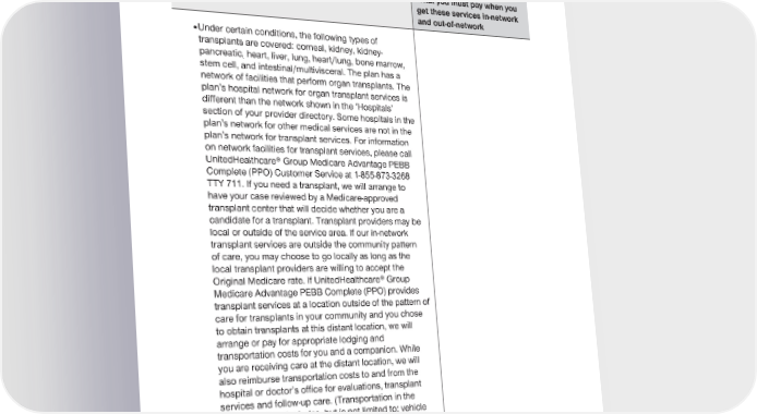 2024 Evidence of Coverage for UnitedHealthcare® Group Medicare Advantage PEBB Complete (PPO) Chapter 4: Medical Benefits Chart (what is covered and what you pay) 97 Services that are covered for you What you must pay when you get these services in-network and out-of-network · Under certain conditions, the following types of transplants are covered: corneal, kidney, kidney- pancreatic, heart, liver, lung, heart/lung, bone marrow, stem cell, and intestinal/multivisceral. The plan has a network of facilities that perform organ transplants. The plan’s hospital network for organ transplant services is different than the network shown in the ‘Hospitals’ section of your provider directory. Some hospitals in the plan’s network for other medical services are not in the plan’s network for transplant services. For information on network facilities for transplant services, please call UnitedHealthcare® Group Medicare Advantage PEBB Complete (PPO) Customer Service at 1-855-873-3268 TTY 711. If you need a transplant, we will arrange to have your case reviewed by a Medicare-approved transplant center that will decide whether you are a candidate for a transplant. Transplant providers may be local or outside of the service area. If our in-network transplant services are outside the community pattern of care, you may choose to go locally as long as the local transplant providers are willing to accept the Original Medicare rate. If UnitedHealthcare® Group Medicare Advantage PEBB Complete (PPO) provides transplant services at a location outside of the pattern of care for transplants in your community and you chose to obtain transplants at this distant location, we will arrange or pay for appropriate lodging and transportation costs for you and a companion. While you are receiving care at the distant location, we will also reimburse transportation costs to and from the hospital or doctor’s office for evaluations, transplant services and follow-up care. (Transportation in the distant location includes, but is not limited to: vehicle mileage, economy/coach airfare, taxi fares, or rideshare services.) Costs for lodging or places to stay such as hotels, motels or short-term housing as a result of travel