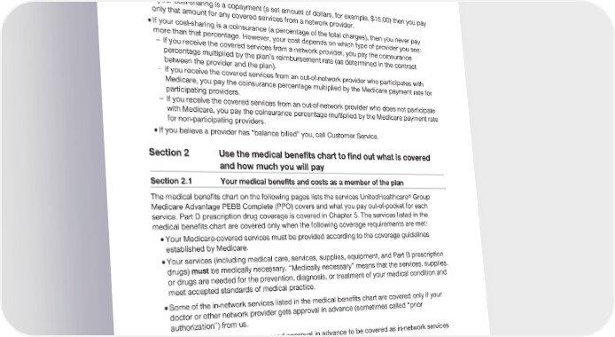 2024 Evidence of Coverage for UnitedHealthcare® Group Medicare Advantage PEBB Complete (PPO) Chapter 4: Medical Benefits Chart (what is covered and what you pay) 73 provider charges for a service and even if there is a dispute and we don’t pay certain provider charges. Here is how this protection works. · If your cost-sharing is a copayment (a set amount of dollars, for example, $15.00) then you pay only that amount for any covered services from a network provider. · If your cost-sharing is a coinsurance (a percentage of the total charges), then you never pay more than that percentage. However, your cost depends on which type of provider you see: - If you receive the covered services from a network provider, you pay the coinsurance percentage multiplied by the plan’s reimbursement rate (as determined in the contract between the provider and the plan). - If you receive the covered services from an out-of-network provider who participates with Medicare, you pay the coinsurance percentage multiplied by the Medicare payment rate for participating providers. - If you receive the covered services from an out-of-network provider who does not participate with Medicare, you pay the coinsurance percentage multiplied by the Medicare payment rate for non-participating providers. · If you believe a provider has “balance billed” you, call Customer Service. Section 2 Use the medical benefits chart to find out what is covered and how much you will pay Section 2.1 Your medical benefits and costs as a member of the plan The medical benefits chart on the following pages lists the services UnitedHealthcare® Group Medicare Advantage PEBB Complete (PPO) covers and what you pay out-of-pocket for each service. Part D prescription drug coverage is covered in Chapter 5. The services listed in the medical benefits chart are covered only when the following coverage requirements are met: · Your Medicare-covered services must be provided according to the coverage guidelines established by Medicare. · Your services (including medical care, services, supplies, equipment, and Part B prescription drugs) must be medically necessary. “Medically necessary” means that the services, supplies, or drugs are needed for the prevention, diagnosis, or treatment of your medical condition and meet accepted standards of medical practice. · Some of the in-network services listed in the medical benefits chart are covered only if your doctor or other network provider gets approval in advance (sometimes called “prior authorization”) from us. - Covered services that may need approval in advance to be covered as in-network services †† are marked by a double dagger ( ) in the medical benefits chart. - Network providers agree by contract to obtain prior authorization from the plan and agree to not balance bill you. - You never need approval in advance for out-of-network services from out-of-network providers.