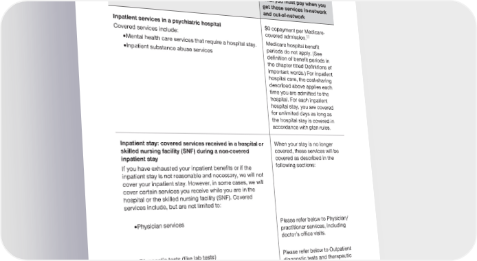 2024 Evidence of Coverage for UnitedHealthcare® Group Medicare Advantage PEBB Complete (PPO) Chapter 4: Medical Benefits Chart (what is covered and what you pay) 99 Services that are covered for you What you must pay when you get these services in-network and out-of-network Inpatient services in a psychiatric hospital $0 copayment per Medicare- covered admission.†† Covered services include: · Mental health care services that require a hospital stay. Medicare hospital benefit · Inpatient substance abuse services periods do not apply. (See definition of benefit periods in the chapter titled Definitions of important words.) For inpatient hospital care, the cost-sharing described above applies each time you are admitted to the hospital. For each inpatient hospital stay, you are covered for unlimited days as long as the hospital stay is covered in accordance with plan rules. Inpatient stay: covered services received in a hospital or When your stay is no longer skilled nursing facility (SNF) during a non-covered covered, these services will be inpatient stay covered as described in the If you have exhausted your inpatient benefits or if the following sections: inpatient stay is not reasonable and necessary, we will not cover your inpatient stay. However, in some cases, we will cover certain services you receive while you are in the hospital or the skilled nursing facility (SNF). Covered services include, but are not limited to: · Physician services Please refer below to Physician/ practitioner services, including doctor’s office visits. · Diagnostic tests (like lab tests) Please refer below to Outpatient diagnostic tests and therapeutic services and supplies.