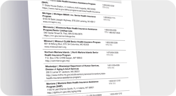 2024 Evidence of Coverage for UnitedHealthcare® Group Medicare Advantage PEBB Complete (PPO) Chapter 2: Important phone numbers and resources 23 State Health Insurance Assistance Programs (SHIP) - Contact Information Maine | Maine State Health Insurance Assistance Program 1-800-262-2232 (SHIP) TTY 711 11 State House Station, 41 Anthony AVE Augusta, ME 04333 https://www.maine.gov/dhhs/programs-services/health-insurance Michigan | Michigan MMAP, Inc. Senior Health Insurance 1-800-803-7174 Program TTY 711 6105 W Saint Joseph Highway, STE 204 Lansing, MI 48917 www.mmapinc.org Minnesota | Minnesota State Health Insurance Assistance 1-800-333-2433 Program/Senior LinkAge Line TTY 1-800-627-3529 540 Cedar Street St. Paul, MN 55164-0976 https://mn.gov/senior-linkage-line Missouri | Missouri CLAIM Senior Health Insurance Program 1-800-390-3330 601 W Nifong Blvd, STE 3A Columbia, MO 65203 TTY 711 www.missouriclaim.org Northern Mariana Islands | North Mariana Islands Senior 1-670-664-3000 Health Insurance Program TTY 711 P.O. Box 5795 CHRB Saipan, MP 96950 http://commerce.gov.mp/ Mississippi | Mississippi Department of Human Services, 1-601-359-4500 Division of Aging & Adult Services TTY 711 200 S Lamar ST Jackson, MS 39201 http://www.mdhs.ms.gov/adults-seniors/services-for-seniors/state- health-insurance-assistance-program/ Montana | Montana State Health Insurance Assistance 1-800-551-3191 Program (SHIP) TTY 711 1100 N Last Chance Gulch, FL 4 Helena, MT 59601 http://dphhs.mt.gov/sltc/aging/ship North Carolina | North Carolina Seniors Health Insurance 1-855-408-1212 Information Program (SHIIP) TTY 711 325 N Salisbury ST Raleigh, NC 27603 http://www.ncdoi.com/SHIIP