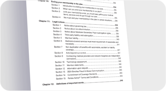 2024 Evidence of Coverage for UnitedHealthcare® Group Medicare Advantage PEBB Complete (PPO) Table of Contents Section 10 How to make a complaint about quality of care, waiting times, customer service, or other concerns....................................................230 Chapter 10: Ending your membership in the plan............................................................... 234 Section 1 Introduction to ending your membership in our plan..........................235 Section 2 When can you end your membership in our plan?............................. 235 Section 3 Until your membership ends, you must keep getting your medical items, services and drugs through our plan.........................................235 Section 4 We must end your membership in the plan in certain situations.......236 Chapter 11: Legal notices....................................................................................................238 Section 1 Notice about governing law...................................................................239 Section 2 Notice about non-discrimination...........................................................239 Section 3 Notice about Medicare Secondary Payer subrogation rights............ 239 Section 4 Third party liability and subrogation..................................................... 239 Section 5 Member liability...................................................................................... 240 Section 6 Medicare-covered services must meet requirement of reasonable and necessary................................................................................................ 241 Section 7 Non duplication of benefits with automobile, accident or liability coverage..................................................................................................241 Section 8 Acts beyond our control........................................................................ 241 Section 9 Contracting medical providers and network hospitals are independent contractors..............................................................................................242 Section 10 Technology assessment........................................................................242 Section 11 Member statements............................................................................... 242 Section 12 Information upon request...................................................................... 242 Section 13 2024 Enrollee Fraud & Abuse Communication................................... 243 Section 14 Commitment of Coverage Decisions....................................................243 Section 15 Renew Active® Terms and Conditions................................................. 243 Chapter 12: Definitions of important words.........................................................................246 QuestionsQuestions?? Call Call CustomCustomer Serviceer Service at at 1-8551-855-873-32-873-326868, TTY , TTY 711711, , 8 a.m.-8 p.m8 a.m.-8 p.m. local time. local time, , Monday-FridayMonday-Friday