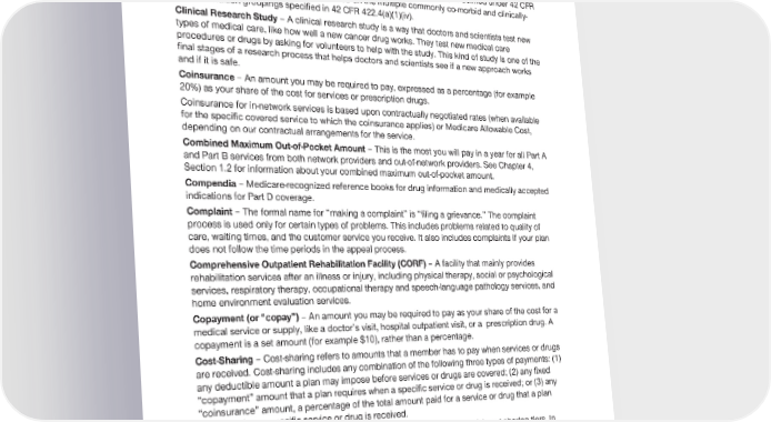 2024 Evidence of Coverage for UnitedHealthcare® Group Medicare Advantage PEBB Complete (PPO) Chapter 12: Definitions of important words 248 Chronic-Care Special Needs Plan – C-SNPs are SNPs that restrict enrollment to MA eligible individuals who have one or more severe or disabling chronic conditions, as defined under 42 CFR 422.2, including restricting enrollment based on the multiple commonly co-morbid and clinically- linked condition groupings specified in 42 CFR 422.4(a)(1)(iv). Clinical Research Study – A clinical research study is a way that doctors and scientists test new types of medical care, like how well a new cancer drug works. They test new medical care procedures or drugs by asking for volunteers to help with the study. This kind of study is one of the final stages of a research process that helps doctors and scientists see if a new approach works and if it is safe. Coinsurance – An amount you may be required to pay, expressed as a percentage (for example 20%) as your share of the cost for services or prescription drugs. Coinsurance for in-network services is based upon contractually negotiated rates (when available for the specific covered service to which the coinsurance applies) or Medicare Allowable Cost, depending on our contractual arrangements for the service. Combined Maximum Out-of-Pocket Amount – This is the most you will pay in a year for all Part A and Part B services from both network providers and out-of-network providers. See Chapter 4, Section 1.2 for information about your combined maximum out-of-pocket amount. Compendia – Medicare-recognized reference books for drug information and medically accepted indications for Part D coverage. Complaint – The formal name for “making a complaint” is “filing a grievance.” The complaint process is used only for certain types of problems. This includes problems related to quality of care, waiting times, and the customer service you receive. It also includes complaints if your plan does not follow the time periods in the appeal process. Comprehensive Outpatient Rehabilitation Facility (CORF) – A facility that mainly provides rehabilitation services after an illness or injury, including physical therapy, social or psychological services, respiratory therapy, occupational therapy and speech-language pathology services, and home environment evaluation services. Copayment (or “copay”) – An amount you may be required to pay as your share of the cost for a medical service or supply, like a doctor’s visit, hospital outpatient visit, or a prescription drug. A copayment is a set amount (for example $10), rather than a percentage. Cost-Sharing – Cost-sharing refers to amounts that a member has to pay when services or drugs are received. Cost-sharing includes any combination of the following three types of payments: (1) any deductible amount a plan may impose before services or drugs are covered; (2) any fixed “copayment” amount that a plan requires when a specific service or drug is received; or (3) any “coinsurance” amount, a percentage of the total amount paid for a service or drug that a plan requires when a specific service or drug is received. Cost-Sharing Tier – Every drug on the list of covered drugs is in one of 4 cost-sharing tiers. In general, the higher the cost-sharing tier, the higher your cost for the drug. Coverage Determination – A decision about whether a drug prescribed for you is covered by the plan and the amount, if any, you are required to pay for the prescription. In general, if you bring your prescription to a pharmacy and the pharmacy tells you the prescription isn’t covered under your plan, that isn’t a coverage determination. You need to call or write to your plan to ask for a