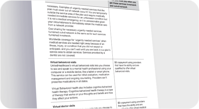 2024 Evidence of Coverage for UnitedHealthcare® Group Medicare Advantage PEBB Complete (PPO) Chapter 4: Medical Benefits Chart (what is covered and what you pay) 125 Services that are covered for you What you must pay when you get these services in-network and out-of-network necessary. Examples of urgently needed services that the plan must cover out of network occur if: You are temporarily outside the service area of the plan and require medically needed immediate services for an unforeseen condition but it is not a medical emergency; or it is unreasonable given your circumstances to immediately obtain the medical care from a network provider. Cost sharing for necessary urgently needed services furnished out-of-network is the same as for such services furnished in-network. Worldwide coverage for ‘urgently needed services’ when medical services are needed right away because of an illness, injury, or condition that you did not expect or anticipate, and you can’t wait until you are back in our plan’s service area to obtain services. Services provided by a dentist are not covered. Virtual behavioral visits $0 copayment using providers UnitedHealthcare’s virtual behavioral visits lets you choose that have the ability and are to see and speak to a mental health professional using your qualified to offer virtual computer or a mobile device, like a tablet or smart phone. behavioral visits. This service can be used for initial evaluation, medication management and ongoing counseling. Providers can’t prescribe medications in all states. Virtual Behavioral Health also includes cognitive behavioral health therapy. Cognitive behavioral health therapy is a type of therapy that works on your thoughts and beliefs and how they affect your actions. Virtual doctor visits $0 copayment using providers UnitedHealthcare’s virtual doctor visits lets you choose to that have the ability and are see and speak to doctors using your computer or a mobile qualified to offer virtual medical visits.