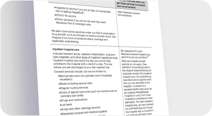 2024 Evidence of Coverage for UnitedHealthcare® Group Medicare Advantage PEBB Complete (PPO) Chapter 4: Medical Benefits Chart (what is covered and what you pay) 96 Services that are covered for you What you must pay when you get these services in-network and out-of-network · Hepatitis B vaccine if you are at high or intermediate other Medicare-covered risk of getting Hepatitis B immunizations. · COVID-19 vaccine · Other vaccines if you are at risk and they meet Medicare Part B coverage rules We also cover some vaccines under our Part D prescription drug benefit, such as shingles or tetanus booster shots. See Chapter 6 for more information about coverage and applicable cost-sharing. Inpatient hospital care $0 copayment for each Includes inpatient acute, inpatient rehabilitation, long-term Medicare-covered hospital stay each time you are admitted.†† care hospitals, and other types of inpatient hospital services. Inpatient hospital care starts the day you are formally Medicare hospital benefit admitted to the hospital with a doctor’s order. The day periods do not apply. (See before you are discharged is your last inpatient day. definition of benefit periods in Covered services include, but are not limited to: the chapter titled Definitions of · Semi-private room (or a private room if medically important words.) For inpatient necessary) hospital care, the cost-sharing described above applies each · Meals including special diets time you are admitted to the · Regular nursing services hospital. A transfer to a · Costs of special care units (such as intensive care or separate facility type (such as coronary care units) an Inpatient Rehabilitation · Drugs and medications Hospital or Long Term Care Hospital) is considered a new · Lab tests admission. For each inpatient · X-rays and other radiology services hospital stay, you are covered · Necessary surgical and medical supplies for unlimited days as long as · Use of appliances, such as wheelchairs the hospital stay is covered in accordance with plan rules. · Operating and recovery room costs · Physical, occupational, and speech language therapy
