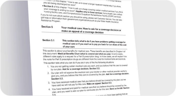 2024 Evidence of Coverage for UnitedHealthcare® Group Medicare Advantage PEBB Complete (PPO) Chapter 9: What to do if you have a problem or complaint (coverage decisions, appeals, complaints) 198 · Section 6 of this chapter: “Your Part D prescription drugs: How to ask for a coverage decision or make an appeal of a coverage decision” · Section 7 of this chapter: “How to ask us to cover a longer inpatient hospital stay if you think you are being discharged too soon” · Section 8 of this chapter: “How to ask us to keep covering certain medical services if you think your coverage is ending too soon” (Applies only to these services: home health care, skilled nursing facility care, and Comprehensive Outpatient Rehabilitation Facility (CORF) services) If you’re not sure which section you should be using, please call Customer Service. You can also get help or information from government organizations such as your State Health Insurance Assistance Program. Section 5 Your medical care: How to ask for a coverage decision or make an appeal of a coverage decision Section 5.1 This section tells what to do if you have problems getting coverage for medical care or if you want us to pay you back for our share of the cost of your care This section is about your benefits for medical care. These benefits are described in Chapter 4 of this document: Medical Benefits Chart (what is covered and what you pay). In some cases, different rules apply to a request for a Part B prescription drug. In those cases, we will explain how the rules for Part B prescription drugs are different from the rules for medical items and services. This section tells what you can do if you are in any of the five following situations: 1. You are not getting certain medical care you want, and you believe that this care is covered by our plan. Ask for a coverage decision. Section 5.2. 2. Our plan will not approve the medical care your doctor or other medical provider wants to give you, and you believe that this care is covered by the plan. Ask for a coverage decision. Section 5.2. 3. You have received medical care that you believe should be covered by the plan, but we have said we will not pay for this care. Make an appeal. Section 5.3. 4. You have received and paid for medical care that you believe should be covered by the plan, and you want to ask our plan to reimburse you for this care. Send us the bill. Section 5.5. 5. You are being told that coverage for certain medical care you have been getting that we previously approved will be reduced or stopped, and you believe that reducing or stopping this care could harm your health. Make an appeal. Section 5.3. Note: If the coverage that will be stopped is for hospital care, home health care, skilled nursing facility care, or Comprehensive Outpatient Rehabilitation Facility (CORF) services, you need to read Sections 7 and 8 of this Chapter. Special rules apply to these types of care.
