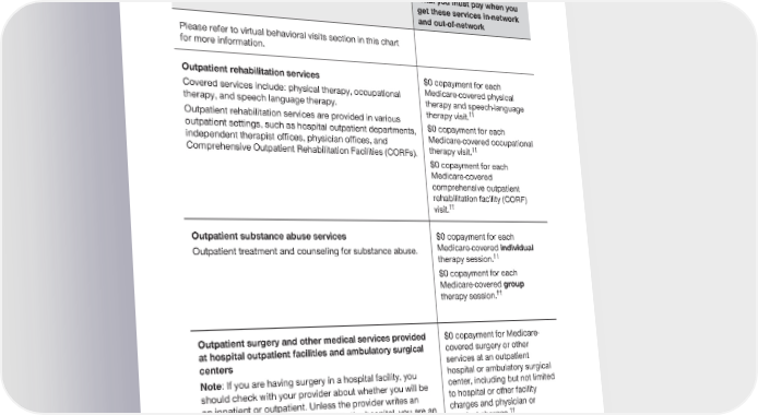 2024 Evidence of Coverage for UnitedHealthcare® Group Medicare Advantage PEBB Complete (PPO) Chapter 4: Medical Benefits Chart (what is covered and what you pay) 111 Services that are covered for you What you must pay when you get these services in-network and out-of-network Please refer to virtual behavioral visits section in this chart for more information. Outpatient rehabilitation services $0 copayment for each Covered services include: physical therapy, occupational Medicare-covered physical therapy, and speech language therapy. therapy and speech-language therapy visit.†† Outpatient rehabilitation services are provided in various outpatient settings, such as hospital outpatient departments, $0 copayment for each independent therapist offices, physician offices, and Medicare-covered occupational therapy visit.†† Comprehensive Outpatient Rehabilitation Facilities (CORFs). $0 copayment for each Medicare-covered comprehensive outpatient rehabilitation facility (CORF) visit.†† Outpatient substance abuse services $0 copayment for each Outpatient treatment and counseling for substance abuse. Medicare-covered individual therapy session.†† $0 copayment for each Medicare-covered group therapy session.†† Outpatient surgery and other medical services provided $0 copayment for Medicare- at hospital outpatient facilities and ambulatory surgical covered surgery or other centers services at an outpatient Note: If you are having surgery in a hospital facility, you hospital or ambulatory surgical should check with your provider about whether you will be center, including but not limited an inpatient or outpatient. Unless the provider writes an to hospital or other facility order to admit you as an inpatient to the hospital, you are an charges and physician or surgical charges.†† outpatient and pay the cost-sharing amounts for outpatient