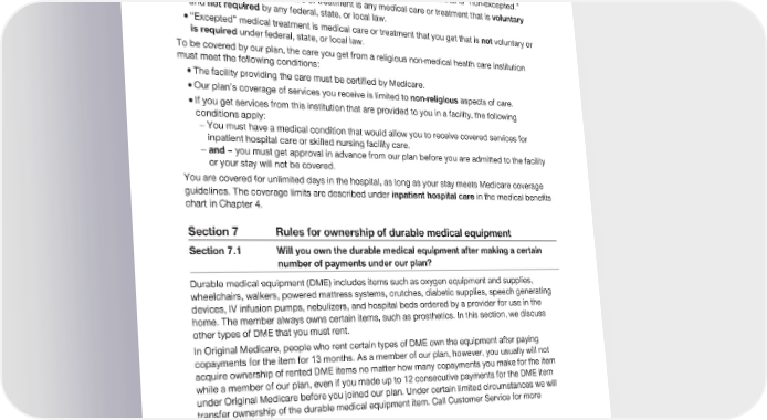2024 Evidence of Coverage for UnitedHealthcare® Group Medicare Advantage PEBB Complete (PPO) Chapter 3: Using the plan for your medical services 69 To get care from a religious non-medical health care institution, you must sign a legal document that says you are conscientiously opposed to getting medical treatment that is “non-excepted.” · “Non-excepted” medical care or treatment is any medical care or treatment that is voluntary and not required by any federal, state, or local law. · “Excepted” medical treatment is medical care or treatment that you get that is not voluntary or is required under federal, state, or local law. To be covered by our plan, the care you get from a religious non-medical health care institution must meet the following conditions: · The facility providing the care must be certified by Medicare. · Our plan’s coverage of services you receive is limited to non-religious aspects of care. · If you get services from this institution that are provided to you in a facility, the following conditions apply: - You must have a medical condition that would allow you to receive covered services for inpatient hospital care or skilled nursing facility care. - and – you must get approval in advance from our plan before you are admitted to the facility or your stay will not be covered. You are covered for unlimited days in the hospital, as long as your stay meets Medicare coverage guidelines. The coverage limits are described under inpatient hospital care in the medical benefits chart in Chapter 4. Section 7 Rules for ownership of durable medical equipment Section 7.1 Will you own the durable medical equipment after making a certain number of payments under our plan? Durable medical equipment (DME) includes items such as oxygen equipment and supplies, wheelchairs, walkers, powered mattress systems, crutches, diabetic supplies, speech generating devices, IV infusion pumps, nebulizers, and hospital beds ordered by a provider for use in the home. The member always owns certain items, such as prosthetics. In this section, we discuss other types of DME that you must rent. In Original Medicare, people who rent certain types of DME own the equipment after paying copayments for the item for 13 months. As a member of our plan, however, you usually will not acquire ownership of rented DME items no matter how many copayments you make for the item while a member of our plan, even if you made up to 12 consecutive payments for the DME item under Original Medicare before you joined our plan. Under certain limited circumstances we will transfer ownership of the durable medical equipment item. Call Customer Service for more information. What happens to payments you made for durable medical equipment if you switch to Original Medicare? If you did not acquire ownership of the DME item while in our plan, you will have to make 13 new consecutive payments after you switch to Original Medicare in order to own the item. The payments made while enrolled in your plan do not count.