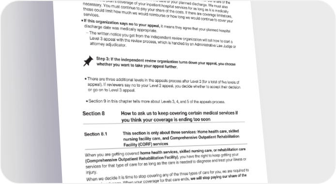 2024 Evidence of Coverage for UnitedHealthcare® Group Medicare Advantage PEBB Complete (PPO) Chapter 9: What to do if you have a problem or complaint (coverage decisions, appeals, complaints) 221 · If this organization says yes to your appeal, then we must pay you back for our share of the costs of hospital care you received since the date of your planned discharge. We must also continue the plan’s coverage of your inpatient hospital services for as long as it is medically necessary. You must continue to pay your share of the costs. If there are coverage limitations, these could limit how much we would reimburse or how long we would continue to cover your services. · If this organization says no to your appeal, it means they agree that your planned hospital discharge date was medically appropriate. The written notice you get from the independent review organization will tell how to start a - Level 3 appeal with the review process, which is handled by an Administrative Law Judge or attorney adjudicator. Step 3: If the independent review organization turns down your appeal, you choose whether you want to take your appeal further. · There are three additional levels in the appeals process after Level 2 (for a total of five levels of appeal). If reviewers say no to your Level 2 appeal, you decide whether to accept their decision or go on to Level 3 appeal. · Section 9 in this chapter tells more about Levels 3, 4, and 5 of the appeals process. Section 8 How to ask us to keep covering certain medical services if you think your coverage is ending too soon Section 8.1 This section is only about three services: Home health care, skilled nursing facility care, and Comprehensive Outpatient Rehabilitation Facility (CORF) services When you are getting covered home health services, skilled nursing care, or rehabilitation care (Comprehensive Outpatient Rehabilitation Facility), you have the right to keep getting your services for that type of care for as long as the care is needed to diagnose and treat your illness or injury. When we decide it is time to stop covering any of the three types of care for you, we are required to tell you in advance. When your coverage for that care ends, we will stop paying our share of the cost for your care. If you think we are ending the coverage of your care too soon, you can appeal our decision. This section tells you how to ask for an appeal. Section 8.2 We will tell you in advance when your coverage will be ending