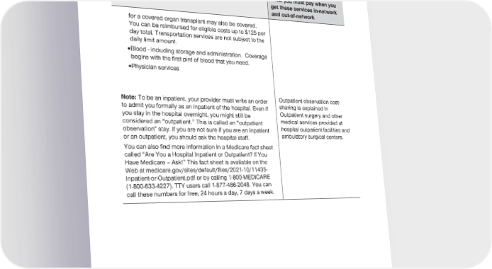 2024 Evidence of Coverage for UnitedHealthcare® Group Medicare Advantage PEBB Complete (PPO) Chapter 4: Medical Benefits Chart (what is covered and what you pay) 98 Services that are covered for you What you must pay when you get these services in-network and out-of-network for a covered organ transplant may also be covered. You can be reimbursed for eligible costs up to $125 per day total. Transportation services are not subject to the daily limit amount. · Blood - including storage and administration. Coverage begins with the first pint of blood that you need. · Physician services Note: To be an inpatient, your provider must write an order Outpatient observation cost- to admit you formally as an inpatient of the hospital. Even if sharing is explained in you stay in the hospital overnight, you might still be Outpatient surgery and other considered an “outpatient.” This is called an “outpatient medical services provided at observation” stay. If you are not sure if you are an inpatient hospital outpatient facilities and or an outpatient, you should ask the hospital staff. ambulatory surgical centers. You can also find more information in a Medicare fact sheet called “Are You a Hospital Inpatient or Outpatient? If You Have Medicare – Ask!” This fact sheet is available on the Web at medicare.gov/sites/default/files/2021-10/11435- Inpatient-or-Outpatient.pdf or by calling 1-800-MEDICARE (1-800-633-4227). TTY users call 1-877-486-2048. You can call these numbers for free, 24 hours a day, 7 days a week.