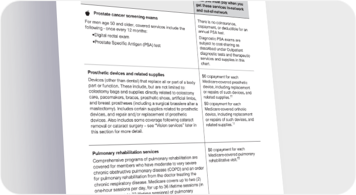 2024 Evidence of Coverage for UnitedHealthcare® Group Medicare Advantage PEBB Complete (PPO) Chapter 4: Medical Benefits Chart (what is covered and what you pay) 118 Services that are covered for you What you must pay when you get these services in-network and out-of-network There is no coinsurance, Prostate cancer screening exams copayment, or deductible for an For men age 50 and older, covered services include the annual PSA test. following - once every 12 months: Diagnostic PSA exams are · Digital rectal exam subject to cost-sharing as · Prostate Specific Antigen (PSA) test described under Outpatient diagnostic tests and therapeutic services and supplies in this chart. Prosthetic devices and related supplies $0 copayment for each Devices (other than dental) that replace all or part of a body Medicare-covered prosthetic part or function. These include, but are not limited to: device, including replacement colostomy bags and supplies directly related to colostomy or repairs of such devices, and related supplies.†† care, pacemakers, braces, prosthetic shoes, artificial limbs, and breast prostheses (including a surgical brassiere after a $0 copayment for each mastectomy). Includes certain supplies related to prosthetic Medicare-covered orthotic devices, and repair and/or replacement of prosthetic device, including replacement devices. Also includes some coverage following cataract or repairs of such devices, and removal or cataract surgery – see “Vision services” later in related supplies.†† this section for more detail. Pulmonary rehabilitation services $0 copayment for each Comprehensive programs of pulmonary rehabilitation are Medicare-covered pulmonary rehabilitative visit.†† covered for members who have moderate to very severe chronic obstructive pulmonary disease (COPD) and an order for pulmonary rehabilitation from the doctor treating the chronic respiratory disease. Medicare covers up to two (2) one-hour sessions per day, for up to 36 lifetime sessions (in some cases, up to 72 lifetime sessions) of pulmonary rehabilitation services.