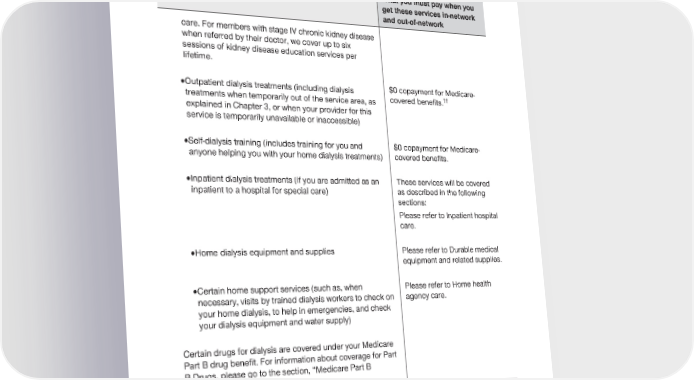 2024 Evidence of Coverage for UnitedHealthcare® Group Medicare Advantage PEBB Complete (PPO) Chapter 4: Medical Benefits Chart (what is covered and what you pay) 122 Services that are covered for you What you must pay when you get these services in-network and out-of-network care. For members with stage IV chronic kidney disease when referred by their doctor, we cover up to six sessions of kidney disease education services per lifetime. · Outpatient dialysis treatments (including dialysis $0 copayment for Medicare- covered benefits.†† treatments when temporarily out of the service area, as explained in Chapter 3, or when your provider for this service is temporarily unavailable or inaccessible) · Self-dialysis training (includes training for you and $0 copayment for Medicare- anyone helping you with your home dialysis treatments) covered benefits. · Inpatient dialysis treatments (if you are admitted as an These services will be covered inpatient to a hospital for special care) as described in the following sections: Please refer to Inpatient hospital care. · Home dialysis equipment and supplies Please refer to Durable medical equipment and related supplies. · Certain home support services (such as, when Please refer to Home health necessary, visits by trained dialysis workers to check on agency care. your home dialysis, to help in emergencies, and check your dialysis equipment and water supply) Certain drugs for dialysis are covered under your Medicare Part B drug benefit. For information about coverage for Part B Drugs, please go to the section, “Medicare Part B prescription drugs.”