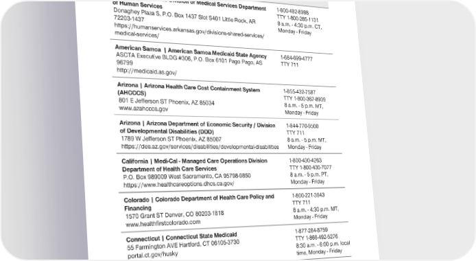 2024 Evidence of Coverage for UnitedHealthcare® Group Medicare Advantage PEBB Complete (PPO) Chapter 2: Important phone numbers and resources 40 State Medicaid Programs – Contact Information Arkansas | Arkansas Division of Medical Services Department 1-800-482-8988 of Human Services TTY 1-800-285-1131 Donaghey Plaza S, P.O. Box 1437 Slot S401 Little Rock, AR 8 a.m. - 4:30 p.m. CT, 72203-1437 Monday - Friday https://humanservices.arkansas.gov/divisions-shared-services/ medical-services/ American Samoa | American Samoa Medicaid State Agency 1-684-699-4777 ASCTA Executive BLDG #306, P.O. Box 6101 Pago Pago, AS TTY 711 96799 http://medicaid.as.gov/ Arizona | Arizona Health Care Cost Containment System 1-855-432-7587 (AHCCCS) TTY 1-800-367-8939 801 E Jefferson ST Phoenix, AZ 85034 8 a.m. - 5 p.m. MT, www.azahcccs.gov Monday - Friday Arizona | Arizona Department of Economic Security / Division 1-844-770-9500 of Developmental Disabilities (DDD) TTY 711 1789 W Jefferson ST Phoenix, AZ 85007 8 a.m. - 5 p.m. MT, https://des.az.gov/services/disabilities/developmental-disabilities Monday - Friday California | Medi-Cal - Managed Care Operations Division 1-800-430-4263 Department of Health Care Services TTY 1-800-430-7077 P.O. Box 989009 West Sacramento, CA 95798-9850 8 a.m. - 5 p.m. PT, https://www.healthcareoptions.dhcs.ca.gov/ Monday - Friday Colorado | Colorado Department of Health Care Policy and 1-800-221-3943 Financing TTY 711 1570 Grant ST Denver, CO 80203-1818 8 a.m. - 4:30 p.m. MT, www.healthfirstcolorado.com Monday - Friday Connecticut | Connecticut State Medicaid 1-877-284-8759 55 Farmington AVE Hartford, CT 06105-3730 TTY 1-866-492-5276 portal.ct.gov/husky 8:30 a.m. - 6:00 p.m. local time, Monday - Friday District of Columbia | DC Department of Human Services 1-202-671-4200 64 New York AVE NE, FL 6 Washington, DC 20002 TTY 711 https://dhs.dc.gov/service/medical-assistance 8 a.m. - 6 p.m. ET, Monday - Friday