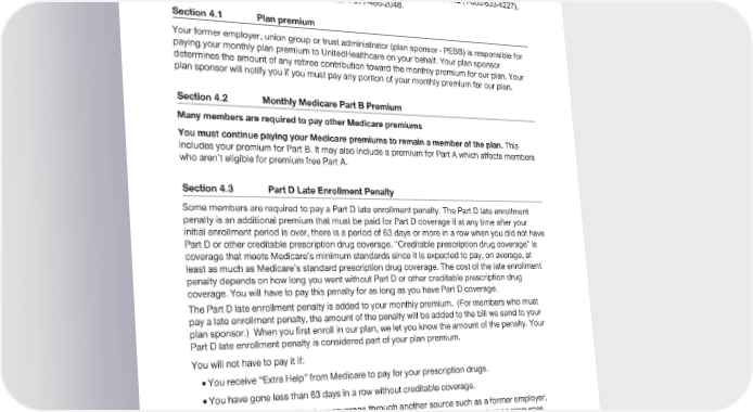 2024 Evidence of Coverage for UnitedHealthcare® Group Medicare Advantage PEBB Complete (PPO) Chapter 1: Getting started as a member 6 (medicare.gov). Or, you can order a printed copy by phone at 1-800-MEDICARE (1-800-633-4227), 24 hours a day, 7 days a week. TTY users call 1-877-486-2048. Section 4.1 Plan premium Your former employer, union group or trust administrator (plan sponsor - PEBB) is responsible for paying your monthly plan premium to UnitedHealthcare on your behalf. Your plan sponsor determines the amount of any retiree contribution toward the monthly premium for our plan. Your plan sponsor will notify you if you must pay any portion of your monthly premium for our plan. Section 4.2 Monthly Medicare Part B Premium Many members are required to pay other Medicare premiums You must continue paying your Medicare premiums to remain a member of the plan. This includes your premium for Part B. It may also include a premium for Part A which affects members who aren’t eligible for premium free Part A. Section 4.3 Part D Late Enrollment Penalty Some members are required to pay a Part D late enrollment penalty. The Part D late enrollment penalty is an additional premium that must be paid for Part D coverage if at any time after your initial enrollment period is over, there is a period of 63 days or more in a row when you did not have Part D or other creditable prescription drug coverage. “Creditable prescription drug coverage” is coverage that meets Medicare’s minimum standards since it is expected to pay, on average, at least as much as Medicare’s standard prescription drug coverage. The cost of the late enrollment penalty depends on how long you went without Part D or other creditable prescription drug coverage. You will have to pay this penalty for as long as you have Part D coverage. The Part D late enrollment penalty is added to your monthly premium. (For members who must pay a late enrollment penalty, the amount of the penalty will be added to the bill we send to your plan sponsor.) When you first enroll in our plan, we let you know the amount of the penalty. Your Part D late enrollment penalty is considered part of your plan premium. You will not have to pay it if: · You receive “Extra Help” from Medicare to pay for your prescription drugs. · You have gone less than 63 days in a row without creditable coverage. · You have had creditable drug coverage through another source such as a former employer, union, TRICARE, or Department of Veterans Affairs. Your insurer or your human resources department will tell you each year if your drug coverage is creditable coverage. This information may be sent to you in a letter or included in a newsletter from the plan. Keep this information, because you may need it if you join a Medicare drug plan later. - Note: Any notice must state that you had “creditable” prescription drug coverage that is expected to pay as much as Medicare’s standard prescription drug plan pays.