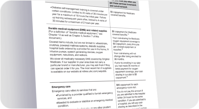 2024 Evidence of Coverage for UnitedHealthcare® Group Medicare Advantage PEBB Complete (PPO) Chapter 4: Medical Benefits Chart (what is covered and what you pay) 86 Services that are covered for you What you must pay when you get these services in-network and out-of-network · Diabetes self-management training is covered under $0 copayment for Medicare- certain conditions. Limited to 20 visits of 30 minutes per covered benefits. year for a maximum of 10 hours the initial year. Follow- up training subsequent years after, limited to 4 visits of 30 minutes for a maximum of 2 hours per year. Durable medical equipment (DME) and related supplies $0 copayment for Medicare- (For a definition of “durable medical equipment,” see covered benefits.†† Chapter 12 as well as Chapter 3, Section 7 of this Your cost-sharing for Medicare document.) oxygen equipment coverage is Covered items include, but are not limited to: wheelchairs, $0 copayment, every time you crutches, powered mattress systems, diabetic supplies, get covered equipment or †† hospital beds ordered by a provider for use in the home, IV supplies. infusion pumps, speech generating devices, oxygen Your cost-sharing will not equipment, nebulizers, and walkers. change after being enrolled for We cover all medically necessary DME covered by Original 36 months. Medicare. If our supplier in your area does not carry a If prior to enrolling in our plan particular brand or manufacturer, you may ask them if they you had made 36 months of can special order it for you. The most recent list of suppliers rental payment for oxygen is available on our website at retiree.uhc.com/wapebb. equipment coverage, your cost- sharing in our plan is $0 copayment.†† Emergency care $65 copayment for each Emergency care refers to services that are: emergency room visit. · Furnished by a provider qualified to furnish emergency You do not pay this amount if services, and you are admitted to the hospital · Needed to evaluate or stabilize an emergency medical within 24 hours for the same condition. condition. If you are admitted to a hospital, you will pay cost- A medical emergency is when you, or any other prudent sharing as described in the layperson with an average knowledge of health and “Inpatient hospital care” section medicine, believe that you have medical symptoms that in this benefit chart. require immediate medical attention to prevent loss of life