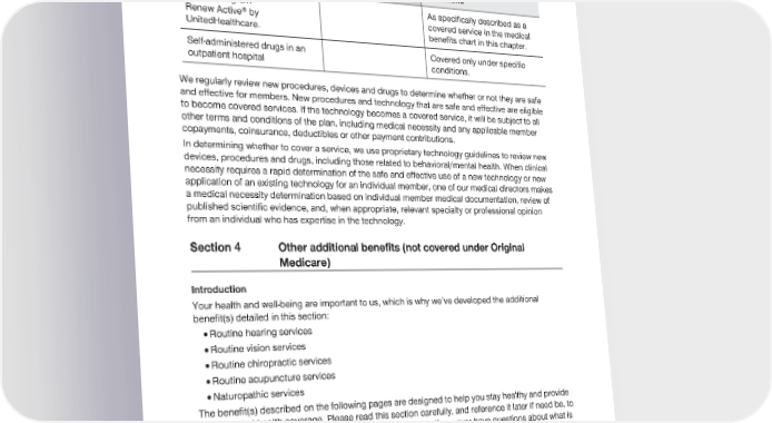 2024 Evidence of Coverage for UnitedHealthcare® Group Medicare Advantage PEBB Complete (PPO) Chapter 4: Medical Benefits Chart (what is covered and what you pay) 135 Services not covered by Not covered under any Covered only under specific Medicare condition conditions Fitness program As specifically described as a Renew Active® by covered service in the medical UnitedHealthcare. benefits chart in this chapter. Self-administered drugs in an Covered only under specific outpatient hospital conditions. We regularly review new procedures, devices and drugs to determine whether or not they are safe and effective for members. New procedures and technology that are safe and effective are eligible to become covered services. If the technology becomes a covered service, it will be subject to all other terms and conditions of the plan, including medical necessity and any applicable member copayments, coinsurance, deductibles or other payment contributions. In determining whether to cover a service, we use proprietary technology guidelines to review new devices, procedures and drugs, including those related to behavioral/mental health. When clinical necessity requires a rapid determination of the safe and effective use of a new technology or new application of an existing technology for an individual member, one of our medical directors makes a medical necessity determination based on individual member medical documentation, review of published scientific evidence, and, when appropriate, relevant specialty or professional opinion from an individual who has expertise in the technology. Section 4 Other additional benefits (not covered under Original Medicare) Introduction Your health and well-being are important to us, which is why we’ve developed the additional benefit(s) detailed in this section: · Routine hearing services · Routine vision services · Routine chiropractic services · Routine acupuncture services · Naturopathic services The benefit(s) described on the following pages are designed to help you stay healthy and provide well-rounded health coverage. Please read this section carefully, and reference it later if need be, to help you know what services are covered under your plan. If you ever have questions about what is covered, how to make a claim or about any other issue, please call Customer Service (phone numbers for Customer Service are on the cover of this booklet). We are always happy to provide answers to any questions you may have. We’re here to serve you. The information in this section describes the following benefits: · Routine eye exam and routine eyewear