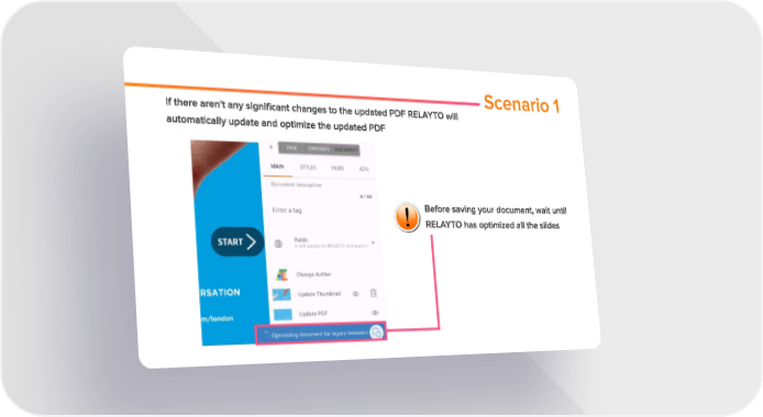 Scenario 1 If there aren't any significant changes to the updated PDF RELAYTO will automatically update and optimize the updated PDF + MAIN STYLES HUBS ADV Document d scnptton 0 / 155 Enter a tag Before saving your document, wait until RELAYTO has optimized all the slides Public Change Author Update Thumbnail <ยง> 1illf Update PDF ""' Opttmiztng document for legacy browsers -